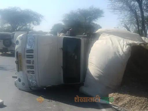 डूंडलोद-मुकुंदगढ़ सड़क पर चारे से भरी पिकअप पलटी:हादसे में चालक सुरक्षित, मामूली चोटें आईं