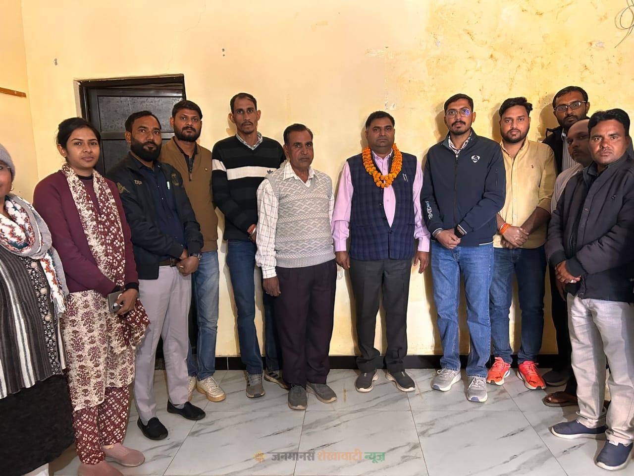 बिसाऊ नगरपालिका ईओ सुरेश कुमार वर्मा को मिठाई खिलाकर व माला पहनाकर विदाई दी