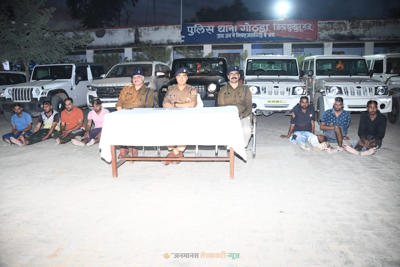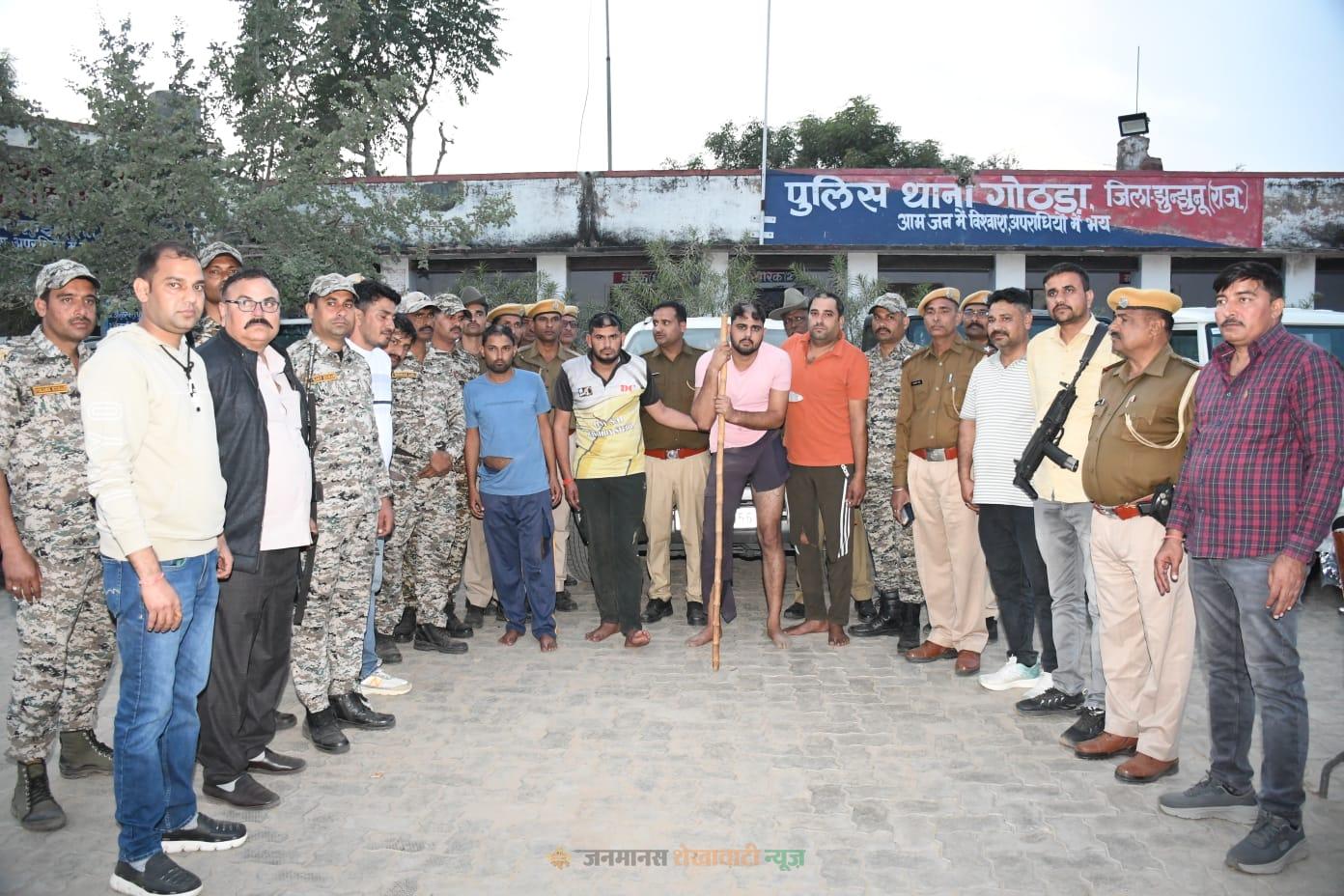 नवलगढ़ : गोठड़ा क्षेत्र के कैमरी की ढाणी, खिरोड़ में जमीन विवाद को लेकर हुई गैंगवार में श्रवण भादवासी गैंग के सक्रिय सदस्य एवं हिस्ट्रीशीटर कृष्णकांत उर्फ रविकांत उर्फ गोलू स्वामी की हत्या के मामले में जिला पुलिस ने कार्रवाई करते हुए चार आरोपियों को गिरफ्तार किया है। पुलिस ने घटना में प्रयुक्त आठ वाहनों को भी जब्त किया है।