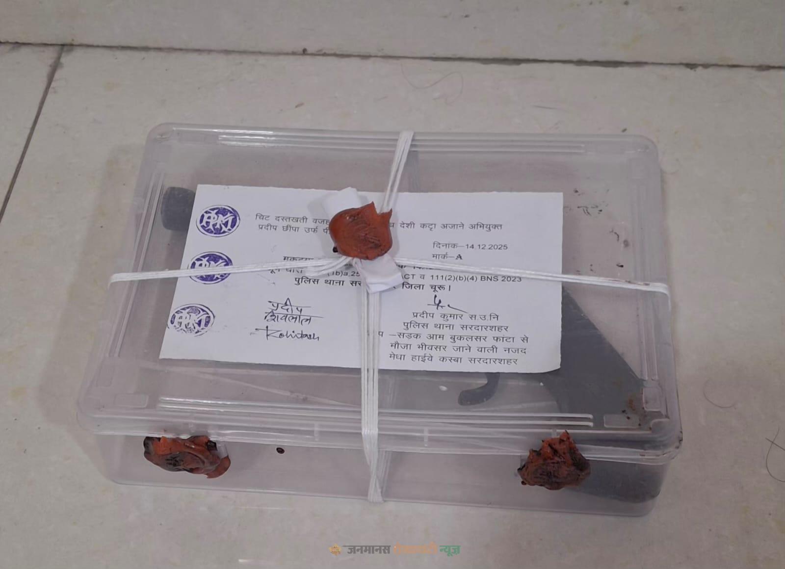 पूछताछ में युवक ने अपनी पहचान प्रदीप छींपा (21) निवासी थाना सरदारशहर के रूप में बताई। तलाशी लेने पर उसके पास से एक अवैध देसी कट्टा बरामद हुआ। पुलिस ने कट्टे को जब्त कर आरोपी प्रदीप छींपा को गिरफ्तार कर लिया।