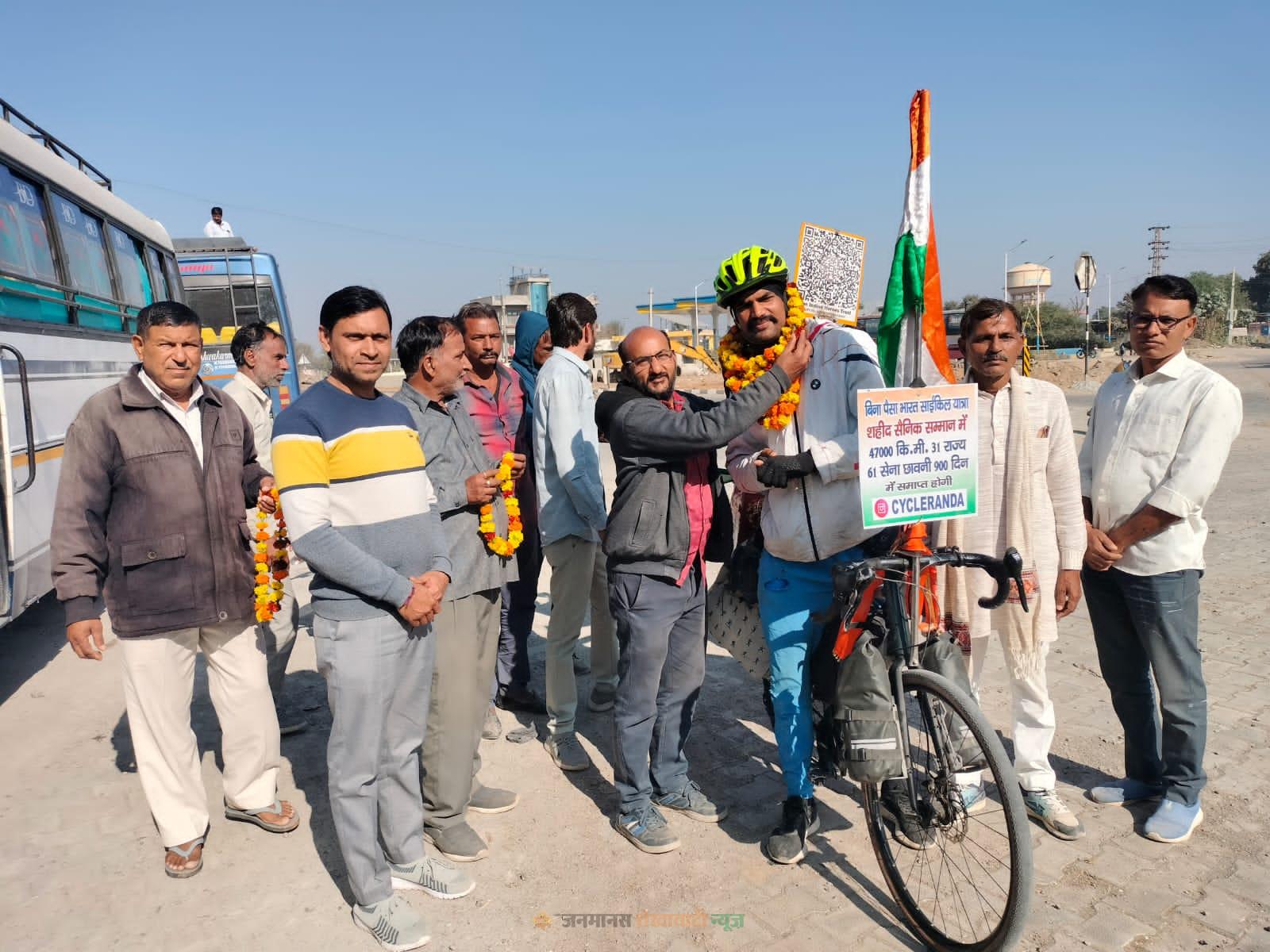 झुंझुनूं : उत्तर प्रदेश के देवरिया निवासी अभिषेक यादव सैनिकों के सम्मान की मांग को लेकर साइकिल से भारत भ्रमण पर निकले हैं। 19 दिसंबर 2024 को शुरू हुई इस देशव्यापी यात्रा के तहत बुधवार को वे अपने सफर के नौवें राज्य राजस्थान में पहुंचे। झुंझुनूं के बीहड़ क्षेत्र में श्री विनायक होटल के पास पहुंचने पर स्थानीय लोगों ने फूल-मालाएं पहनाकर उनका स्वागत किया।