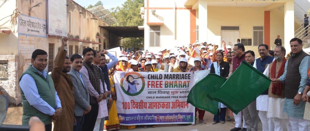 चूरू : भारत सरकार के निर्देशानुसार चल रहे 100 दिवसीय बाल विवाह मुक्त भारत अभियान के तहत शुक्रवार को जिला मुख्यालय के पुराने कलेक्ट्रेट परिसर से जागरूकता रैली निकाली गई। रैली को चूरू विधायक हरलाल सहारण ने हरी झंडी दिखाकर रवाना किया।