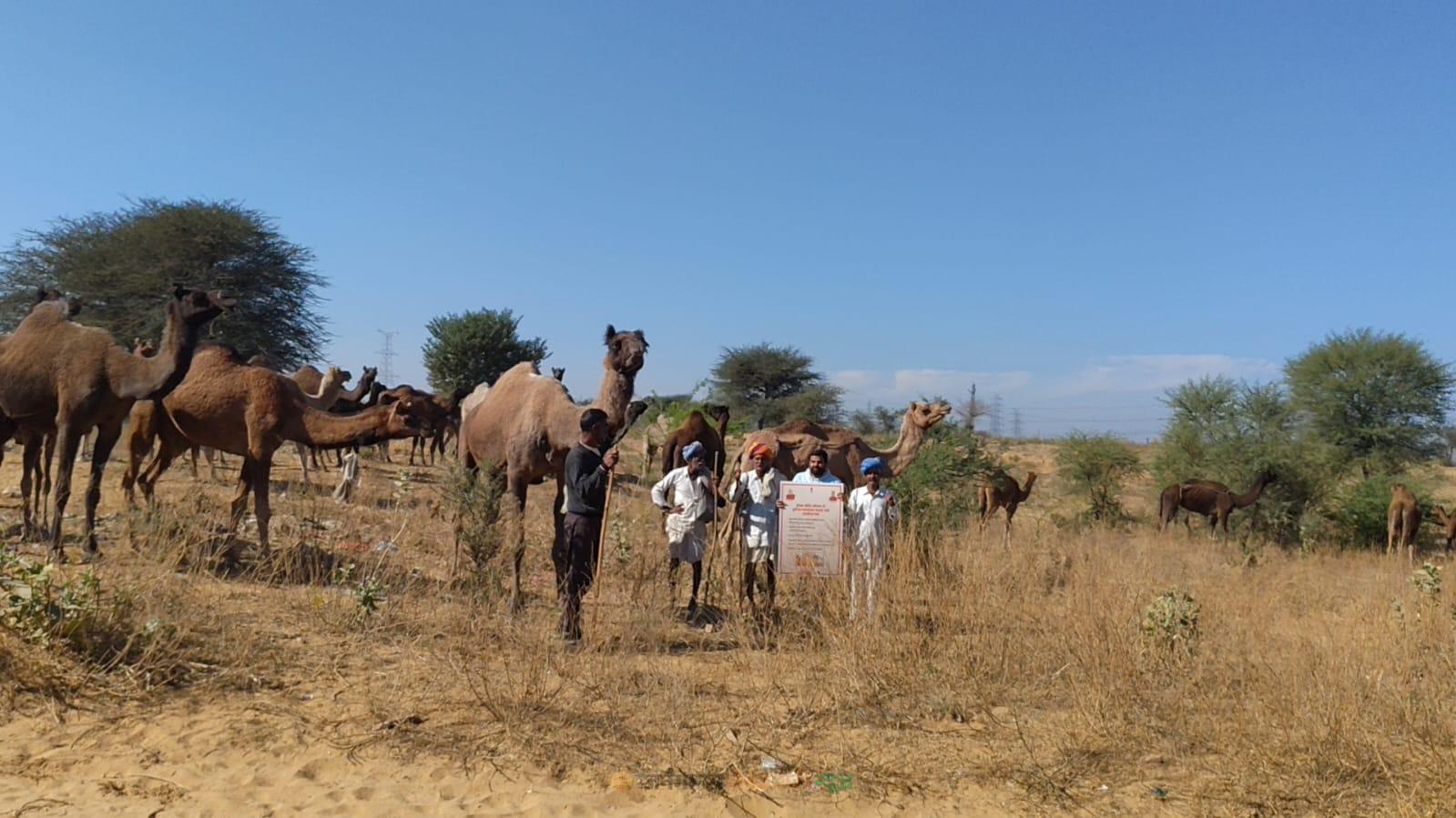 जसरापुर में ऊंट पर बैठकर मंगला पशु बीमा का प्रचार:पशु चिकित्सक ने टोले संग गांव-गांव बताई पंजीकरण प्रक्रिया, अधिकतम 10 ऊंटों का बीमा करवा सकेगा