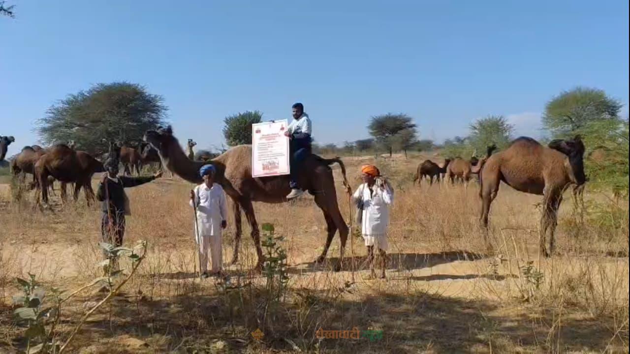 खेतड़ी : खेतड़ी उपखंड के जसरापुर क्षेत्र में मंगला पशु बीमा योजना 2025-26 के तहत पंजीकरण कार्य पूरे जोर-शोर से जारी है। योजना के अधिक से अधिक प्रचार-प्रसार के लिए पशुपालन विभाग नवाचार के साथ मैदान में उतर आया है। जसरापुर, खेतड़ी क्षेत्र के पशु चिकित्सक डॉ. योगेश आर्य ने ऊंटों के टोले के बीच पहुंचकर ऊंट पर बैठकर हाथ में बैनर लेकर मंगला पशु बीमा योजना का अनोखे ढंग से प्रचार किया, जिसने ग्रामीणों का ध्यान आकर्षित किया।