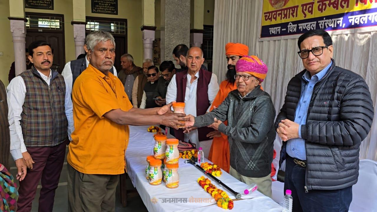 नवलगढ़ : गोविंदराम बासोतिया चैरिटेबल ट्रस्ट द्वारा स्वर्गीय पुष्पा देवी बासोतिया की जयंती के अवसर पर जरूरतमंद लोगों को च्यवनप्राश एवं कंबल वितरण कार्यक्रम का आयोजन किया गया। कार्यक्रम का उद्देश्य जरूरतमंदों को स्वास्थ्य एवं सर्दी से बचाव हेतु सहयोग प्रदान करना रहा।