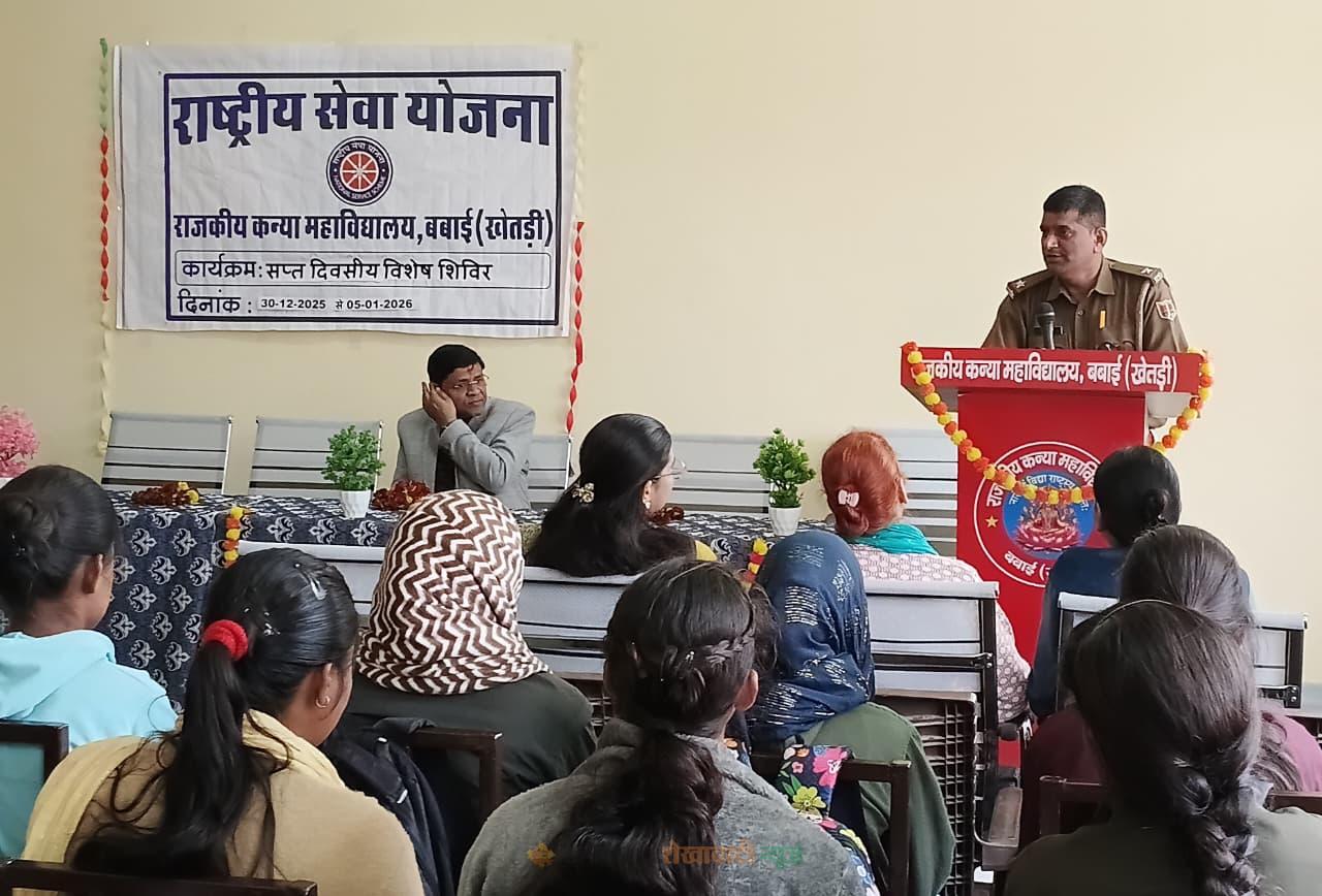 बबाई : राजकीय कन्या महाविद्यालय बबाई में चल रहे,सप्त दिवसीय एन एस.एस शिविर के दूसरे दिन कार्यक्रम की शुरूआत मां सरस्वती वंदना से शुरु हुई। तथा स्वयंसेविकाओं व छात्राओं नें योग प्रणायाम कार्यक्रम में उत्साह पूर्वक भाग लिया। तथा इसके बाद साईबर सुरक्षा विषय पर जागरूकता व्याख्यान का आयोजन किया गया। व्याख्यान में बबाई थाने के सहायक उपनिरिक्षक बाबुलाल गूर्जर द्वारा छात्राओं को साईबर अपराधों के विभिन्न प्रकार व उनसे बचाव के उपाय, सोसल मिडिया सुरक्षा, ओंन लाइन धोखाधडी, डिजिटल अरेस्ट एंव डिजिटल सतर्कता के विषय में विस्तार से जानकारी दी। कार्यक्रम की अध्यक्षता महाविद्यालय के प्राचार्य डॉ देवीशंकर शर्मा नें की व कार्यक्रम का संचालन उषा रघुवीर नें किया। तथा कार्यक्रम के अन्त में शिविर प्रभारी डॉ बेगराज कुमावत नें वक्ताओं-का आभार व्यक्त किया।