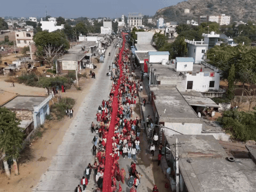 शक्तिपीठ शाकंभरी माता को चढ़ाई 8000 फीट लंबी चुनरी:ढोल-नगाड़ों-डीजे के साथ 18KM पैदल चलकर पहुंचे श्रद्धालु, मंदिर में दर्शनों के लिए लंबी लाइनें लग गई