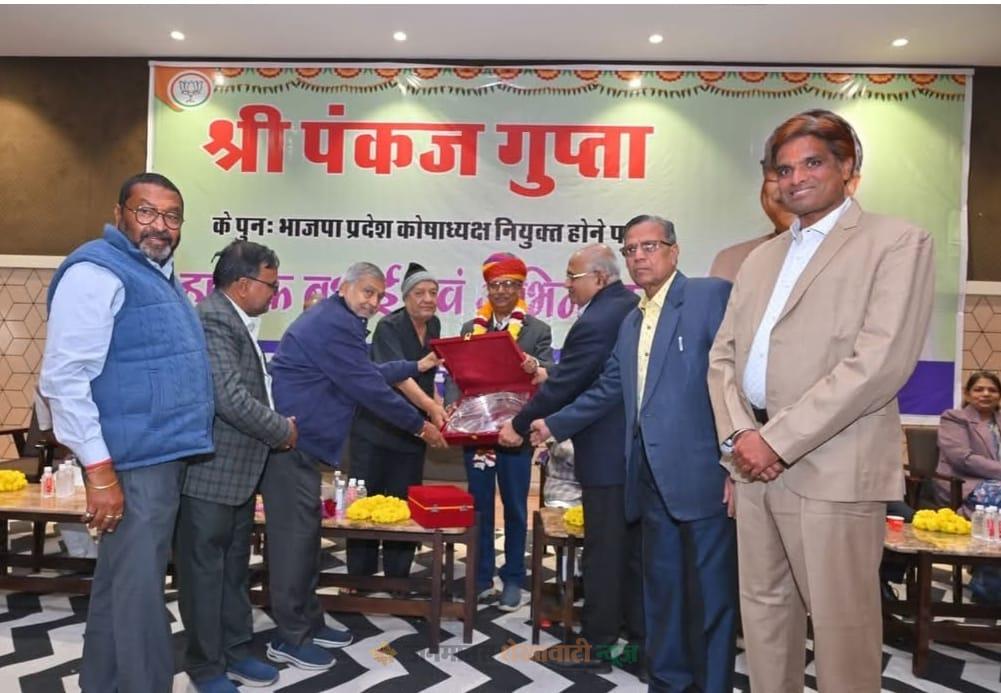 वहीं डॉ प्रेम प्रकाश गोयल, सुरेंद्र खेमका, बजरंग बाजोरिया, संजय सिंघानिया, राज मोदी, डॉ सारिका अग्रवाल, कालीचरण खेमका, विनीत बजाज,वेणुगोपाल मंडावेवाला, श्रीकांत बगड़िया, सुशील बजाज, शेरू गोयनका, महेश गोयनका, मुरलीधर ऊँटवालिया, प्रदीप सरावगी, अंकित बाजोरिया, रघुनाथ खेमका, कल्पेश सराफ, अरविंद बगड़िया, काशीराम क्याल, राजेश भावसिंहका, चंद्रशेखर झुंझुनूंवाला ने भाजपा प्रदेश कोषाध्यक्ष पंकज गुप्ता का माला, साफा, शॉल, श्रीफल, मोमेंटो, अभिनंदन पत्र, अग्रसेन जी की प्रतिमा के साथ सम्मान किया। पवन बगड़िया ने अभिनंदन पत्र का वाचन किया।