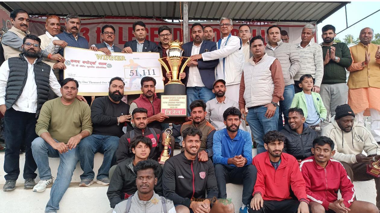 मुख्य अतिथि डॉ. अशोक झाझड़िया ने अपने संबोधन में खिलाड़ियों को निरंतर प्रयास, एकाग्रता और अथक मेहनत पर बल देते हुए प्रेरित किया। उन्होंने कहा कि खेल केवल जीत-हार नहीं, बल्कि चरित्र निर्माण का माध्यम भी है। टूर्नामेंट का मैन ऑफ द टूर्नामेंट का खिताब ए.बी. फिल्म्स नुआ के जोशी को प्रदान किया गया। प्रत्येक मैच में मैन ऑफ द मैच का पुरस्कार दिया गया, जिसके प्रायोजक मोबाइल सिटी झुंझुनूं रहे।