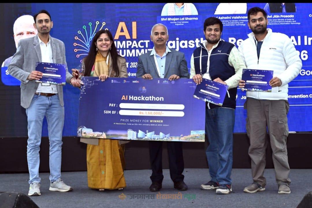 डिजीफेस्ट-2026 के तहत आयोजित इस 36 घंटे के मैराथन हैकाथॉन में राजस्थान भर से स्टार्टअप्स, नवाचारको, डेवलपर्स एवं विद्यार्थियों ने भाग लिया। हैकाथॉन का मुख्य उद्देश्य शिक्षा, कृषि, रोजगार, स्वास्थ्य एवं जनकल्याण से जुड़ी समस्याओं के लिए एआई आधारित तकनीकी समाधान विकसित करना था। टीम द्वारा आर्टिफिशियल इंटेलिजेंस आधारित समाधान को निर्णायक मंडल द्वारा सराहा गया। इस समाधान की व्यावहारिक उपयोगिता और राजकीय कार्यालयों की कार्यप्रणाली में प्रभावी आवश्यकता को देखते हुए टीम ने प्रथम स्थान प्राप्त किया।