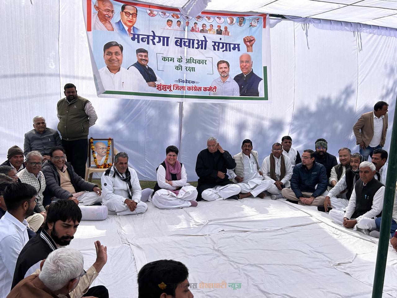 झुंझुनूं : कांग्रेस पार्टी ने महात्मा गांधी राष्ट्रीय ग्रामीण रोजगार गारंटी अधिनियम (मनरेगा) को बचाने के लिए अपने राष्ट्रव्यापी आह्वान के तहत रविवार को मनरेगा बचाओ संग्राम-जनआंदोलन का शंखनाद किया। जिला मुख्यालय स्थित अंबेडकर पार्क में जिला प्रभारी रामसिंह कस्वां, सांसद बृजेन्द्र ओला, पूर्व मंत्री डॉ. जितेंद्र सिंह और जिलाध्यक्ष रीटा चौधरी के नेतृत्व में कांग्रेस कार्यकर्ताओं ने एक दिवसीय उपवास रखकर केंद्र की भाजपा सरकार की नीतियों के खिलाफ कड़ा विरोध दर्ज कराया।
