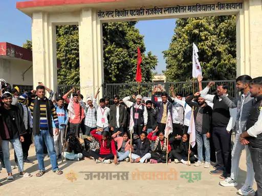 नीमकाथाना : छात्र संगठन एसएफआई ने आज शेखावाटी विश्वविद्यालय की स्नातक परीक्षाओं के समय में संशोधन और एसएनकेपी महाविद्यालय के छात्रों के परीक्षा केंद्र दूरस्थ निजी महाविद्यालयों में दिए जाने के विरोध में प्रदर्शन किया। संगठन ने महाविद्यालय के मुख्य गेट पर तालाबंदी कर धरना दिया और प्राचार्य को कुलपति के नाम ज्ञापन सौंपा।