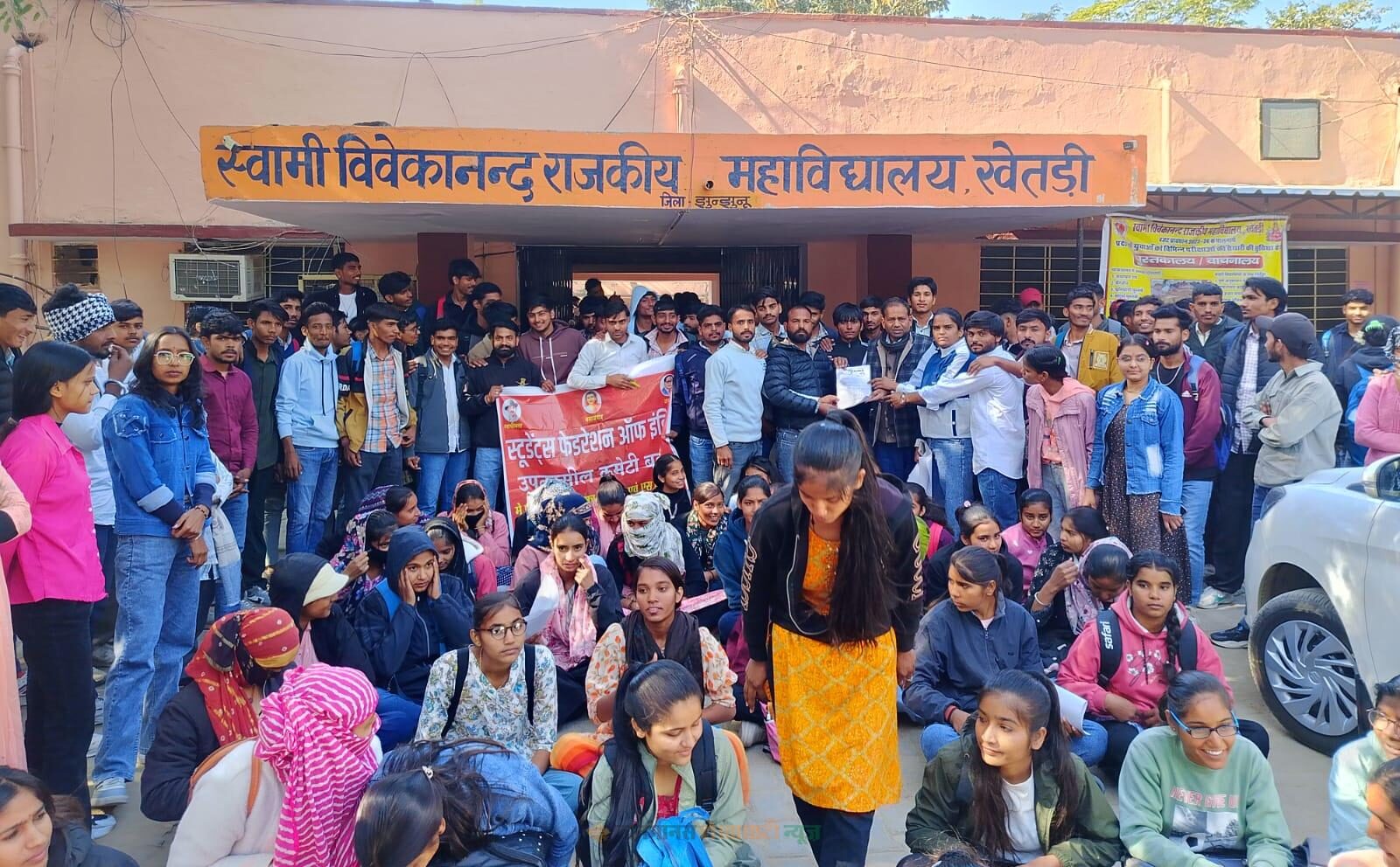 स्नातक प्रथम सेमेस्टर परीक्षाओं का समय बदलने की मांग को लेकर एसएफआई का प्रदर्शन, स्वामी विवेकानंद राजकीय महाविद्यालय खेतड़ी का गेट बंद कर दिया धरना
