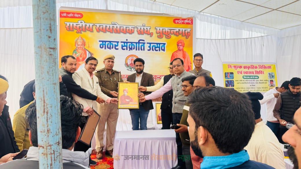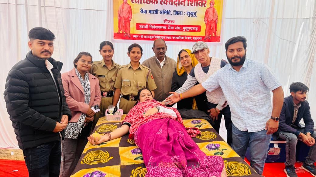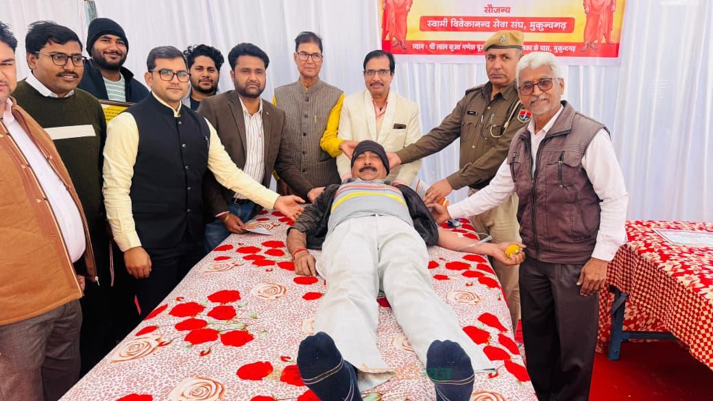 मुकुंदगढ़ : कस्बे में सोमवार को राष्ट्रीय युवा दिवस के अवसर पर नगरपालिका के पास स्थित श्री लाल कुआं गणेश पूजा स्थल पर तृतीय स्वैच्छिक रक्तदान शिविर का आयोजित हुआ। सेवा भारती समिति, झुंझुनूं एवं स्वामी विवेकानंद सेवा संघ के तत्वावधान में आयोजित तृतीय स्वैच्छिक रक्तदान शिविर के मुख्य अतिथि थानाधिकारी ताराचंद यादव रहे । अध्यक्षता मंडावा खंड संघ चालक प्रेमपाल दूलर ने की। पालिका अध्यक्ष मनीष कुमार, अधिशाषी अधिकारी रविंद्र धनकड़, डॉ. सुशील शर्मा विशिष्ट अतिथि के रूप में मंचस्थ रहे। शिविर का शुभारंभ डॉ. केशवराम बलिराम हेडगेवार, माधवराव सदाशिवराव गोवलकर, भारत माता, स्वामी विवेकानंद व भगत सिंह के चित्रों के समक्ष दीप प्रज्ज्वलित कर किया गया। शिविर में पधारे अतिथियों को स्वामी विवेकानंद का चित्र देकर सम्मानित किया गया।
