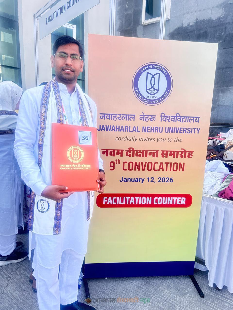 गोठड़ा/नवलगढ़ : जवाहरलाल नेहरू विश्वविद्यालय, दिल्ली में 12 जनवरी को आयोजित 9वें दीक्षांत समारोह में देवगांव (गोठड़ा) निवासी मेघाराम जांगिड के सुपुत्र महेन्द्र कुमार जांगिड को कंप्यूटर साइंस विषय में पीएचडी की उपाधि प्रदान की गई। यह गौरवपूर्ण समारोह महामहिम उपराष्ट्रपति सी. पी. राधाकृष्णन के मुख्य आतिथ्य में संपन्न हुआ।