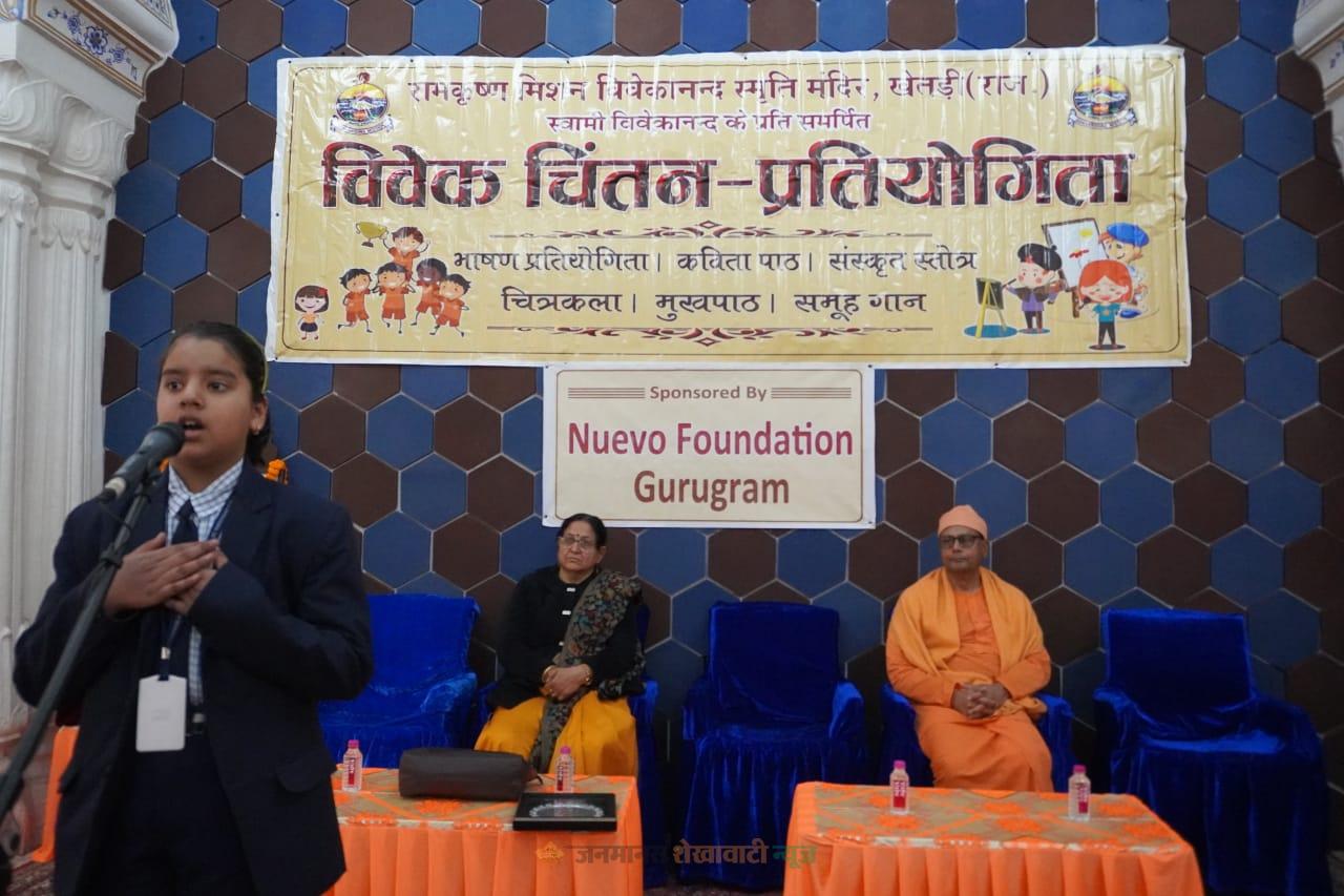 खेतड़ी : रामकृष्ण मिशन विवेकानंद स्मृति मंदिर, खेतड़ी में तीन दिवसीय विवेक चिंतन उत्सव का समारोहपूर्वक उद्घाटन किया गया। कार्यक्रम में खण्ड मुख्य शिक्षा अधिकारी अनुकम्पा अरडावतिया एवं खण्ड मुख्य चिकित्सा अधिकारी डॉ. हरीश यादव मुख्य अतिथि के रूप में उपस्थित रहे, जबकि अध्यक्षता स्वामी आत्मनिष्ठानंद महाराज ने की। उद्घाटन अवसर पर विवेकानंद के विचारों पर प्रकाश डालते हुए युवाओं से उनके आदर्शों को जीवन में अपनाने का आह्वान किया गया।