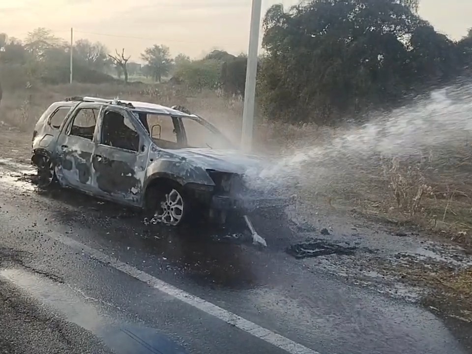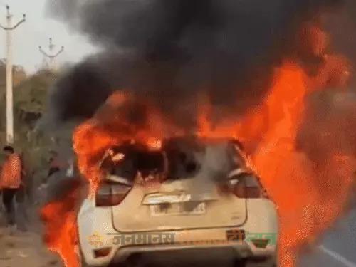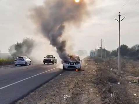 पिलानी में चलती कार में लगी आग:धुआं उठता देख सवारों ने कूदकर बचाई जान