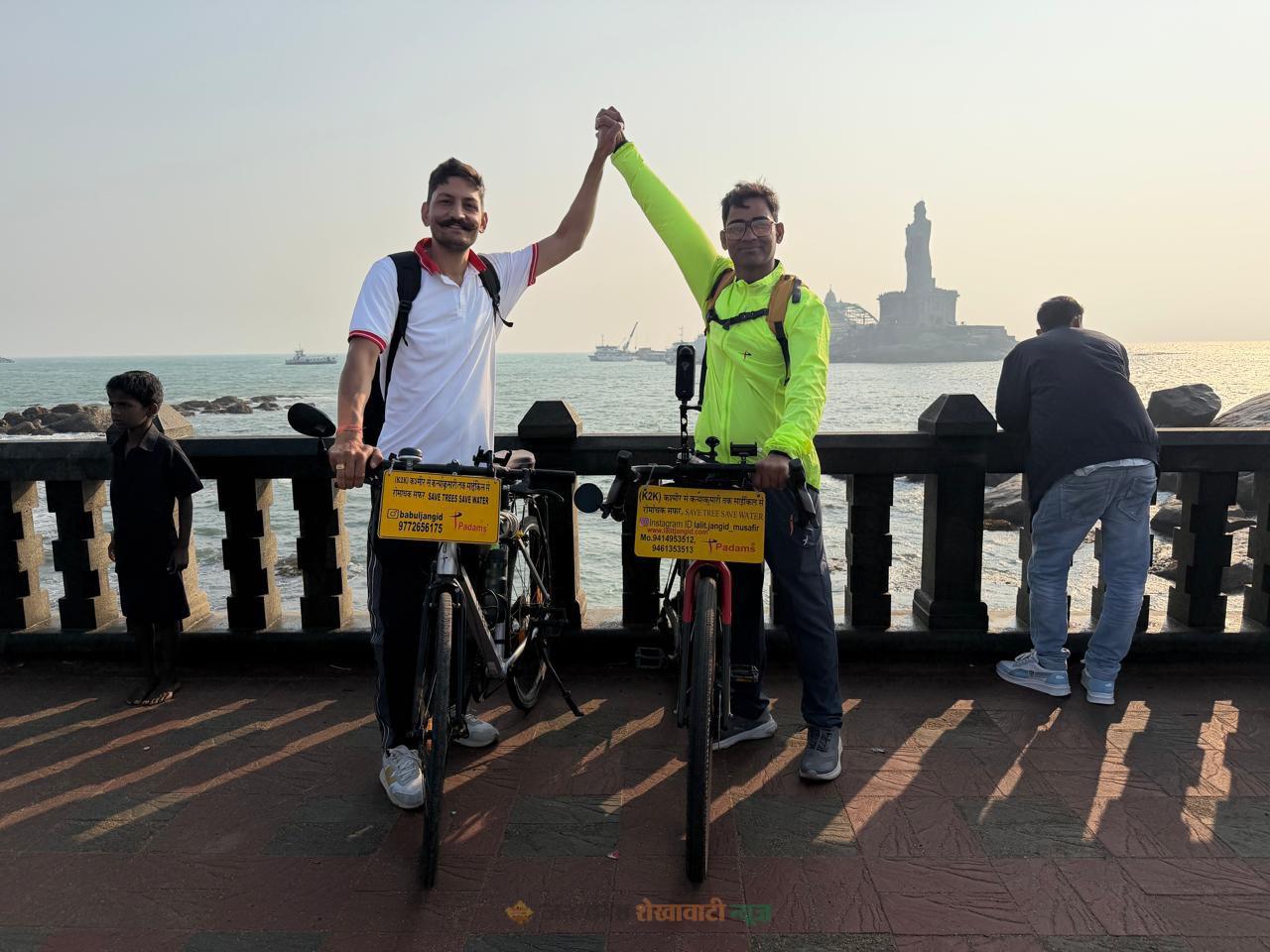 चूरू : जिला मुख्यालय से एक बार फिर ललित जांगिड़ चूरू ने अपने साथी निखिल जांगिड़ पलसाना सीकर के साथ कश्मीर से कन्याकुमारी तक साइकिल यात्रा करके चूरू जिले का इतिहास रचा एवं राजस्थान और भारत अपना नाम सुनहरे अक्षरों में लिख दिया।