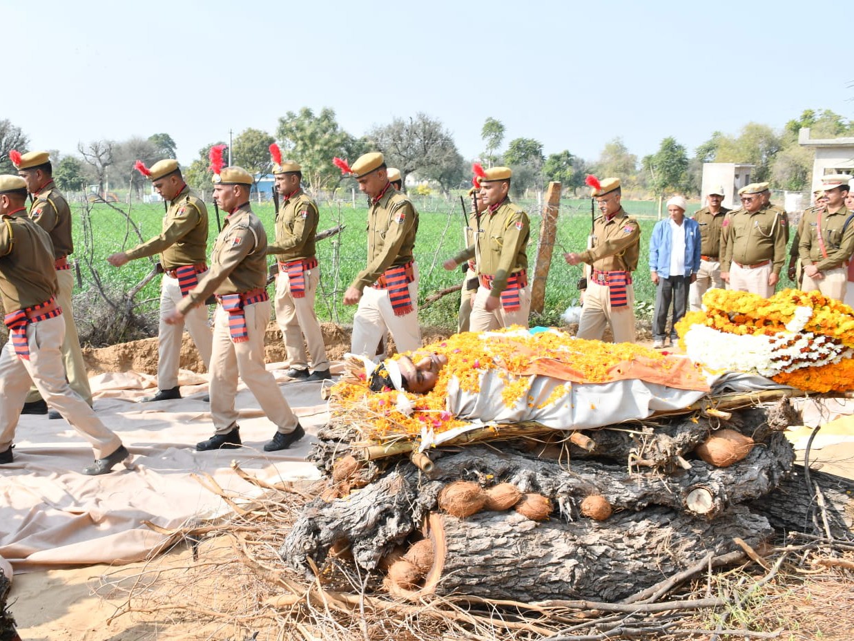 मंगलवार को राजेंद्र कुमार का अंतिम संस्कार उनके पैतृक गांव में पुलिस सम्मान के साथ किया गया। पुलिसकर्मियों ने उन्हें गार्ड ऑफ ऑनर देकर अंतिम विदाई दी। बड़े बेटे ने पिता को मुखाग्नि दी। इस दौरान CI सुरेंद्र देवड़ा, डिप्टी लक्ष्मणगढ़ दिलीप मीणा समेत अन्य पुलिसकर्मी और ग्रामीण मौजूद रहे।