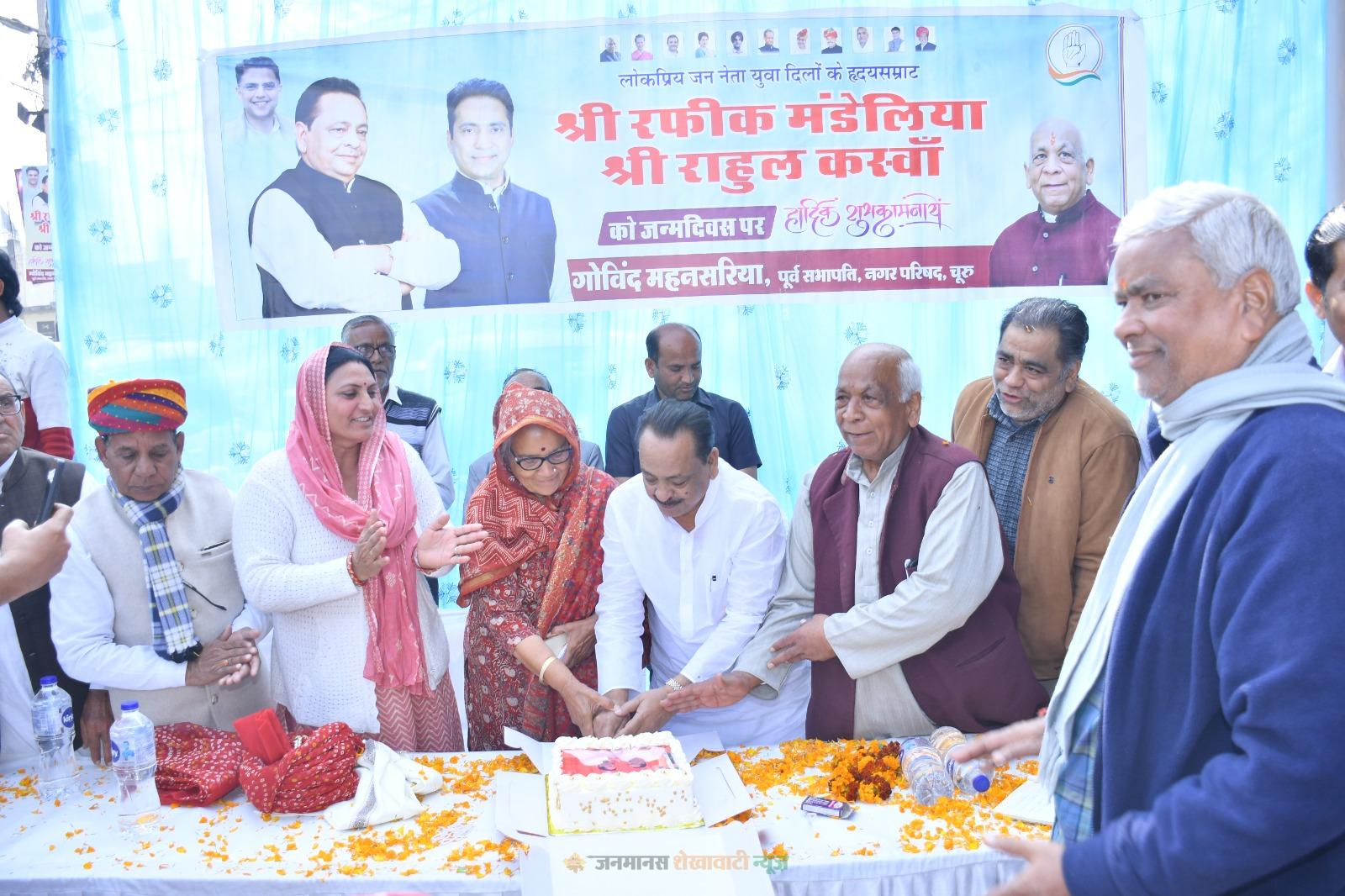 चूरू : प्रदेश कांग्रेस कमेटी के उपाध्यक्ष रफीक मंडेलिया एवं सांसद राहुल कस्वा के जन्मदिवस के अवसर पर जिला मुख्यालय स्थित नई सड़क पर उत्सव जैसा माहौल देखने को मिला। चूरू नगर परिषद के पूर्व सभापति गोविंद महनसरिया के नेतृत्व में व्यापारियों ने केक काटकर जन्मदिवस मनाया।
