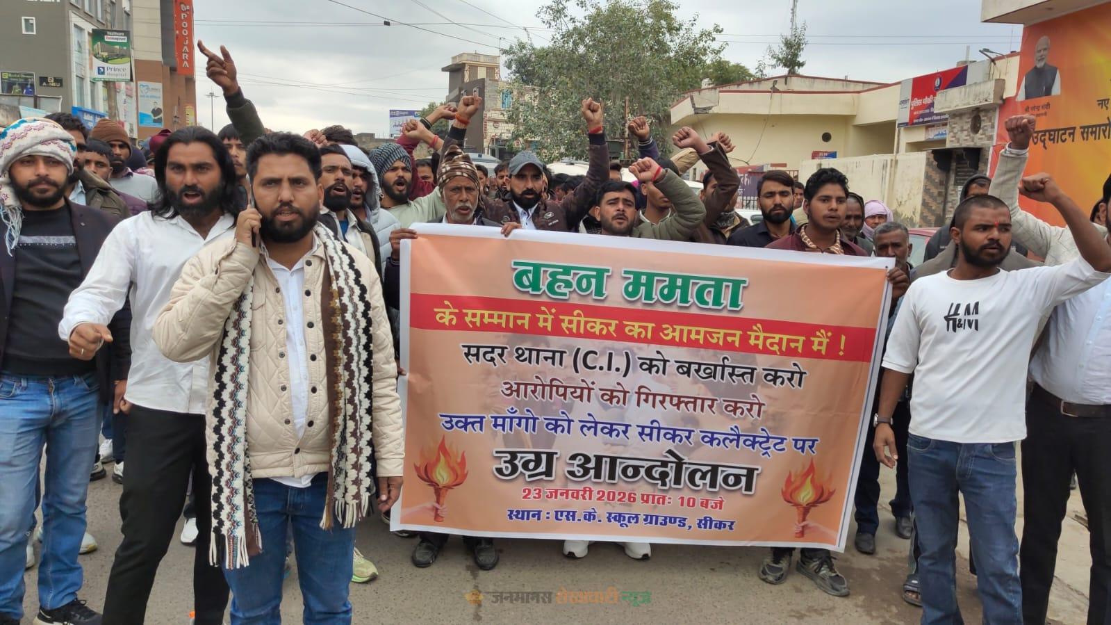 सीकर : सीकर में सदर एसएचओ और एसडीएम पर कार्रवाई की मांग को लेकर शुक्रवार को ग्रामीणों ने आक्रोश रैली निकाली, जो एसके स्कूल ग्राउंड से शुरू होकर कलेक्ट्रेट पहुंची। जहां जिला कलेक्टर मुकुल शर्मा को मुख्यमंत्री के नाम ज्ञापन सौंपा।