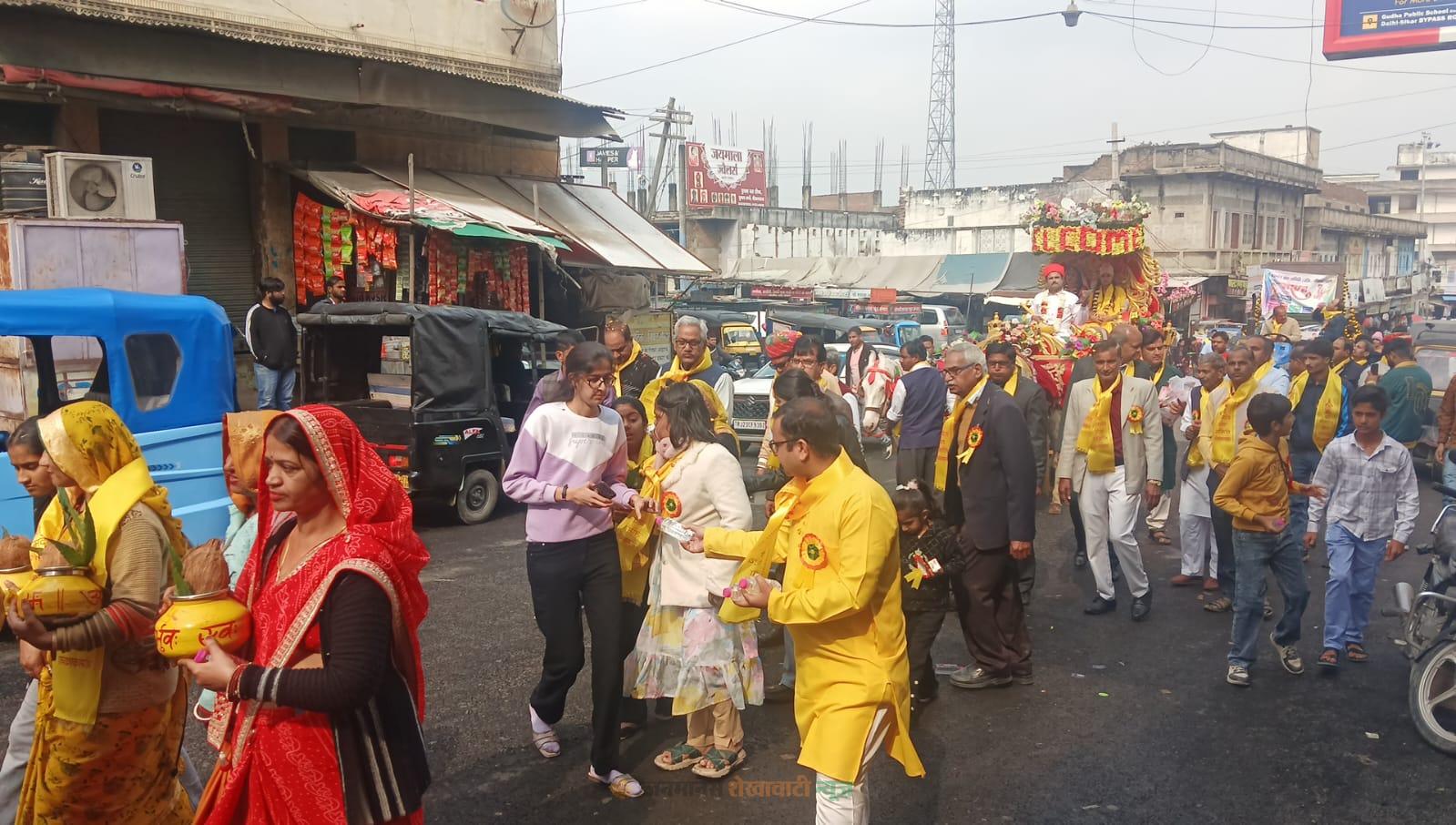 नीमकाथाना : नीमकाथाना में बसंत पंचमी के अवसर पर नामदेव समाज द्वारा शोभायात्रा निकाली गई। यह शोभायात्रा नामदेव मंदिर से शुरू हुई। शोभायात्रा शहर के मुख्य मार्गों से गुजरी। इस दौरान विभिन्न सामाजिक और व्यापारिक संगठनों के पदाधिकारियों ने पुष्प वर्षा कर इसका स्वागत किया।