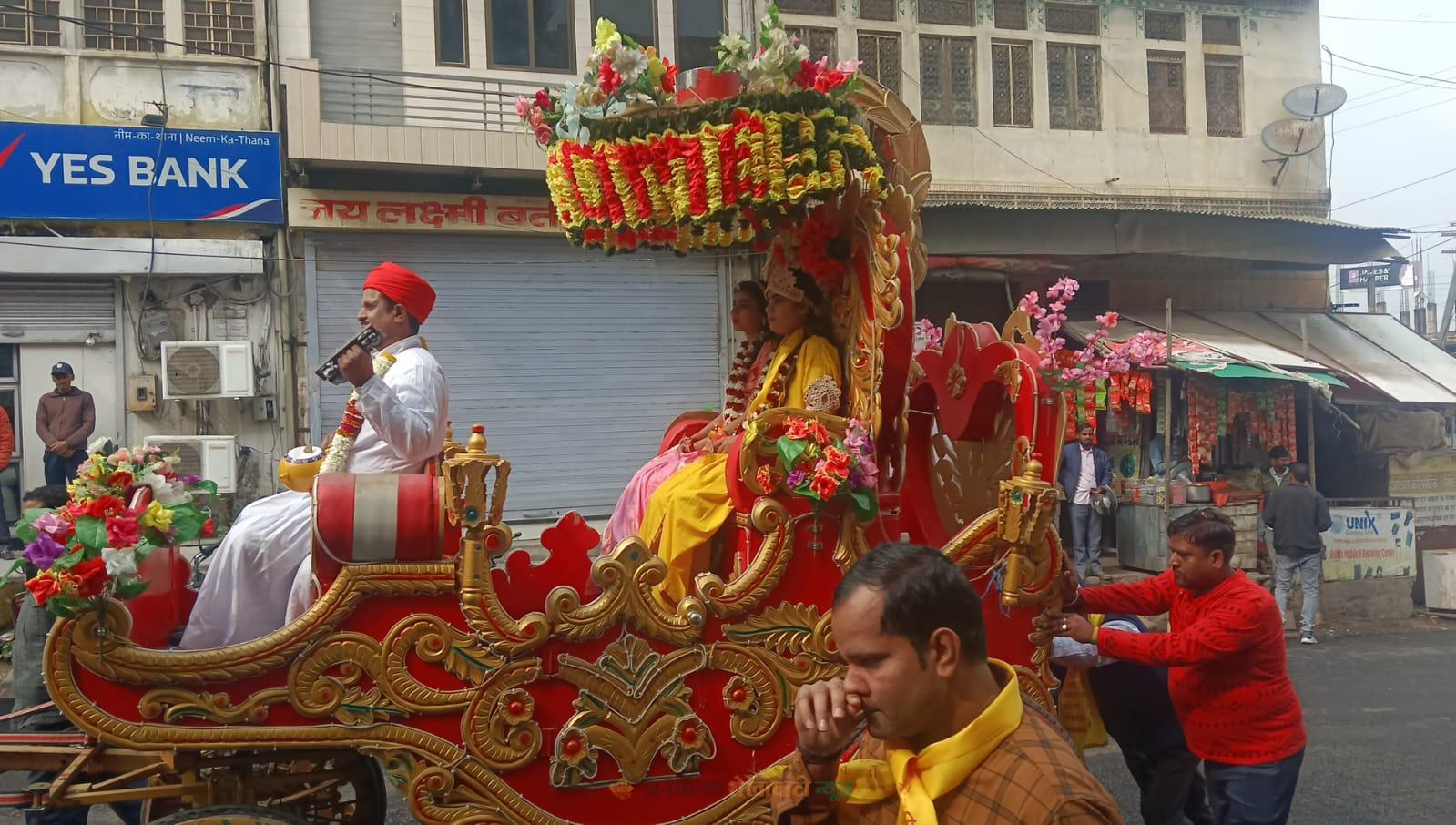 नीमकाथाना में बसंत पंचमी पर शोभायात्रा निकाली:शहर के मुख्य मार्गों से गुजरी, पुष्प वर्षा कर स्वागत हुआ