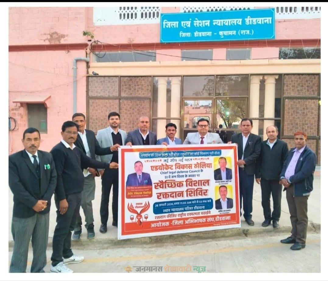 डीडवाना के प्रथम चीफ लीगल डिफेंस कौंसिल एडवोकेट विकास ठोलिया के जन्मदिन पर रक्तदान शिविर 26 जनवरी को, पोस्टर का विमोचन