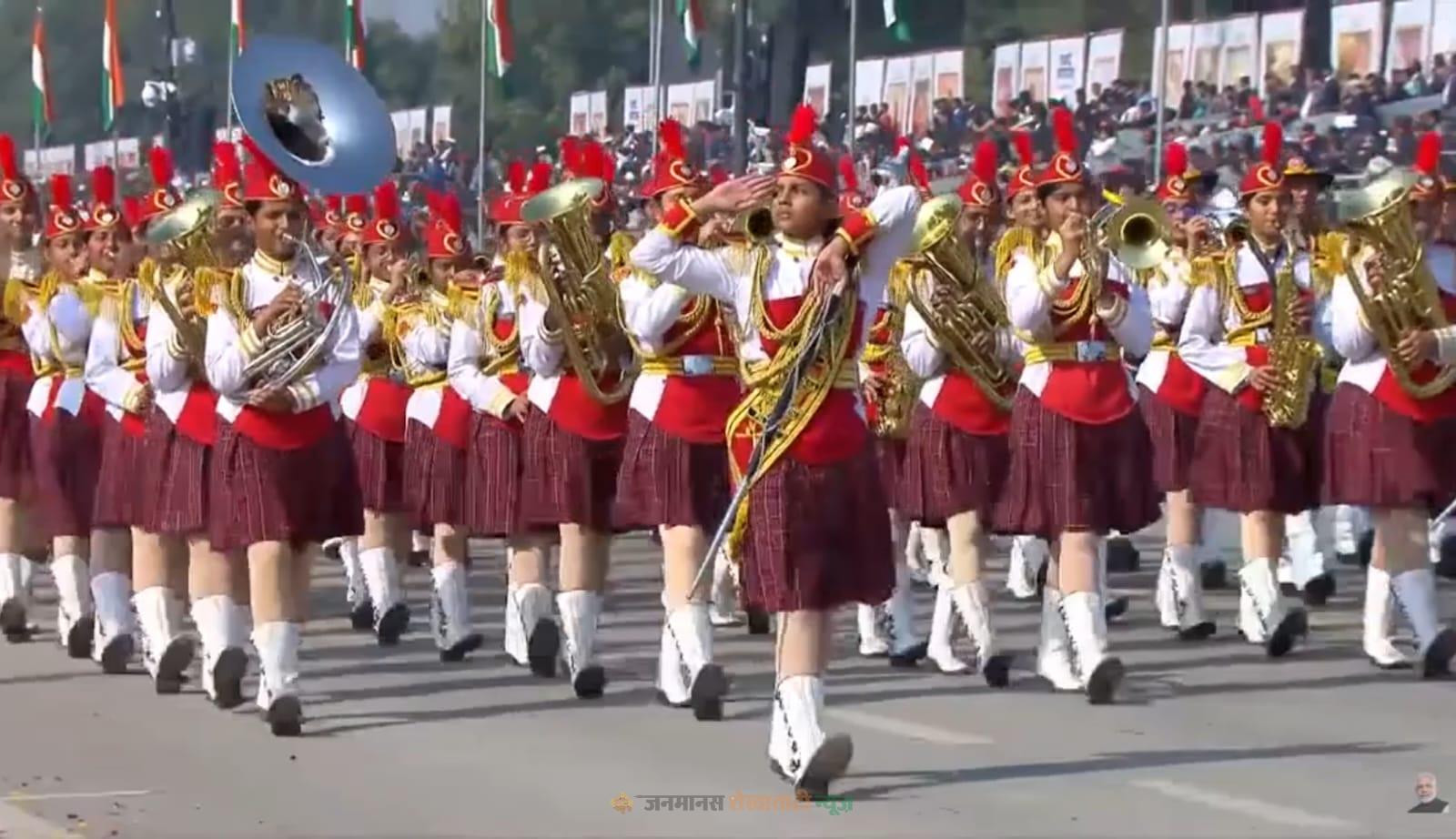 छात्राओं ने कठोर अभ्यास, समर्पण और अनुशासन का प्रदर्शन करते हुए सुसंगठित मार्चिंग की। उन्होंने देशभक्ति से ओतप्रोत धुनों के साथ कर्तव्य पथ पर अपनी उपस्थिति दर्ज कराई।