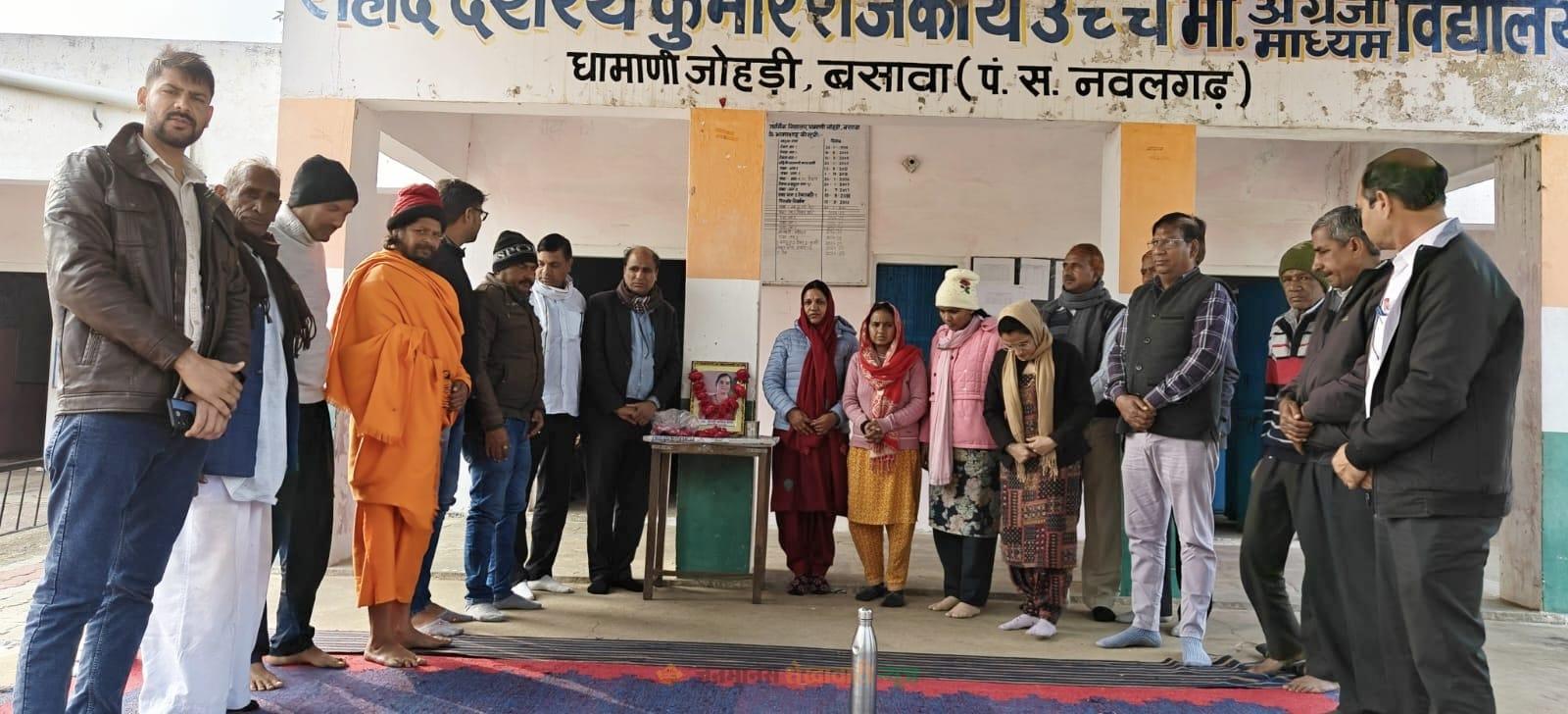 बसावा (नवलगढ़़) : शहीद दशरथ कुमार राजकीय उच्च माध्यमिक विद्यालय धामाणी जोहड़ी बसावा में कार्यरत हँसमुख, मिलनसार एवं कर्तव्यनिष्ठ अध्यापिका श्रीमती कविता शर्मा के आकस्मिक निधन पर आज दिनांक 27 जनवरी 2026 को विद्यालय परिसर में भावपूर्ण श्रद्धांजलि सभा का आयोजन किया गया।