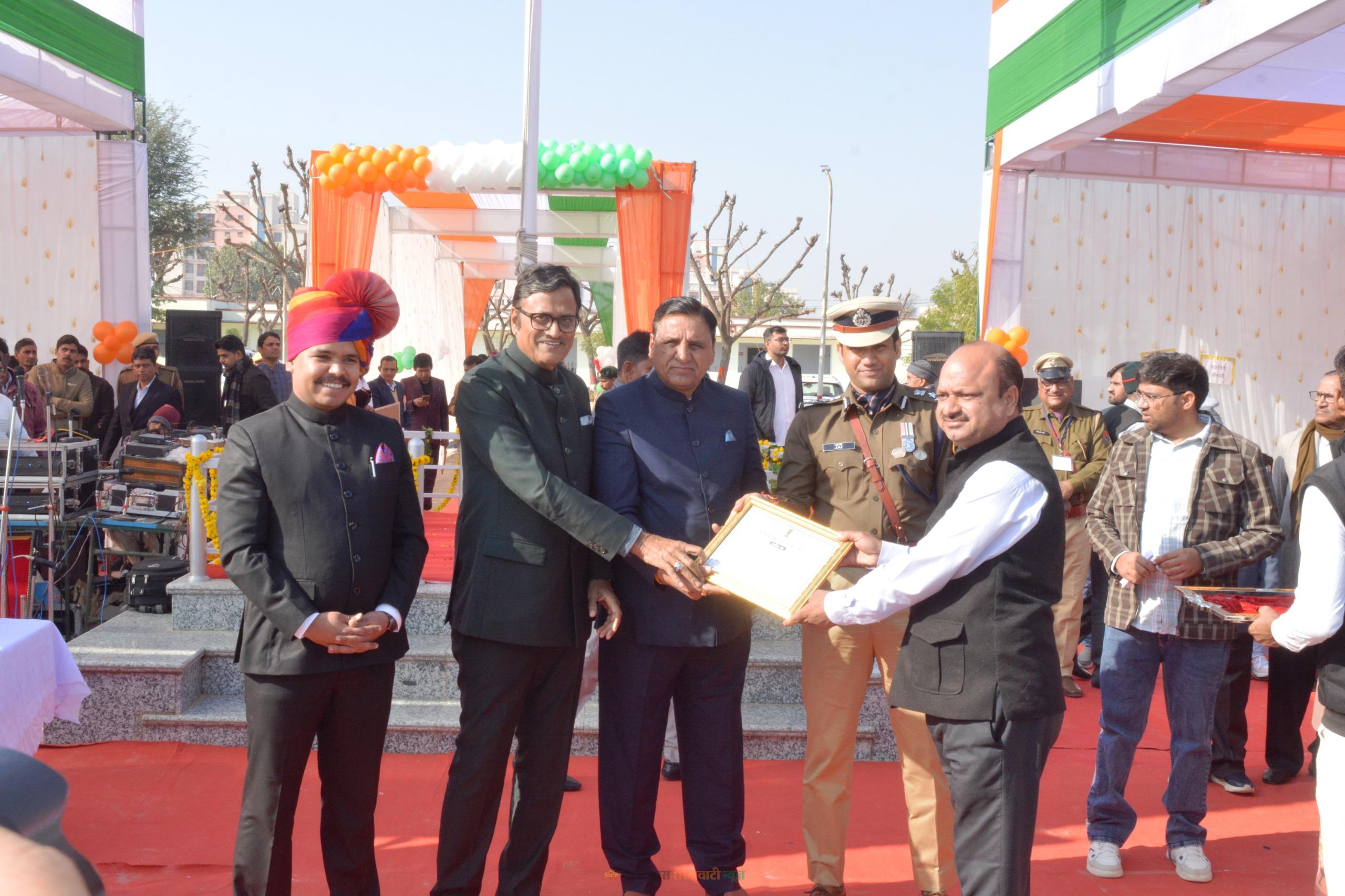 समारोह में आरआई मुकुट बिहारी के नेतृत्व में राजस्थान पुलिस, महिला पुलिस, होम गार्ड एवं एनसीसी, स्काउट-गाइड ने मार्च पास्ट किया। जिला कलक्टर अभिषेक सुराणा, विधायक हरलाल सहारण, पूर्व मंत्री राजेन्द्र राठौड़, एसपी जय यादव ने जिले में उत्कृष्ट कार्य एवं बेहतर उपलब्धियों पर जिले के 58 अधिकारियों, कर्मचारियों, विद्यार्थियों, खिलाड़ियों एवं नागरिकों को प्रशस्ति-पत्र प्रदान कर सम्मानित किया। उन्होंने वीरांगनाओं व लोकतंत्र सेनानियों का शॉल ओढ़ाकर सम्मान किया।
