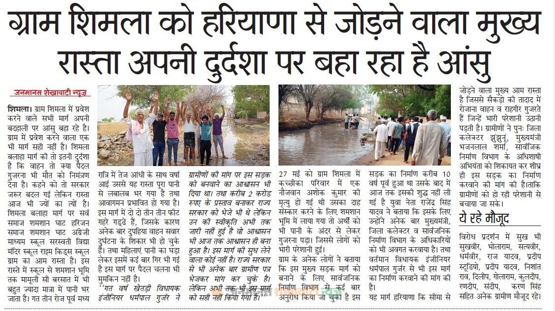 गांव में प्रवेश करने वाला मुख्य मार्ग अत्यंत जर्जर हालत में है, जहां से गुजरना भी जान जोखिम में डालने जैसा है। जनप्रतिनिधियों द्वारा खेतड़ी क्षेत्र में सड़कों के विकास को लेकर किए जा रहे दावों के विपरीत ग्राम शिमला के हालात जस के तस बने हुए हैं।