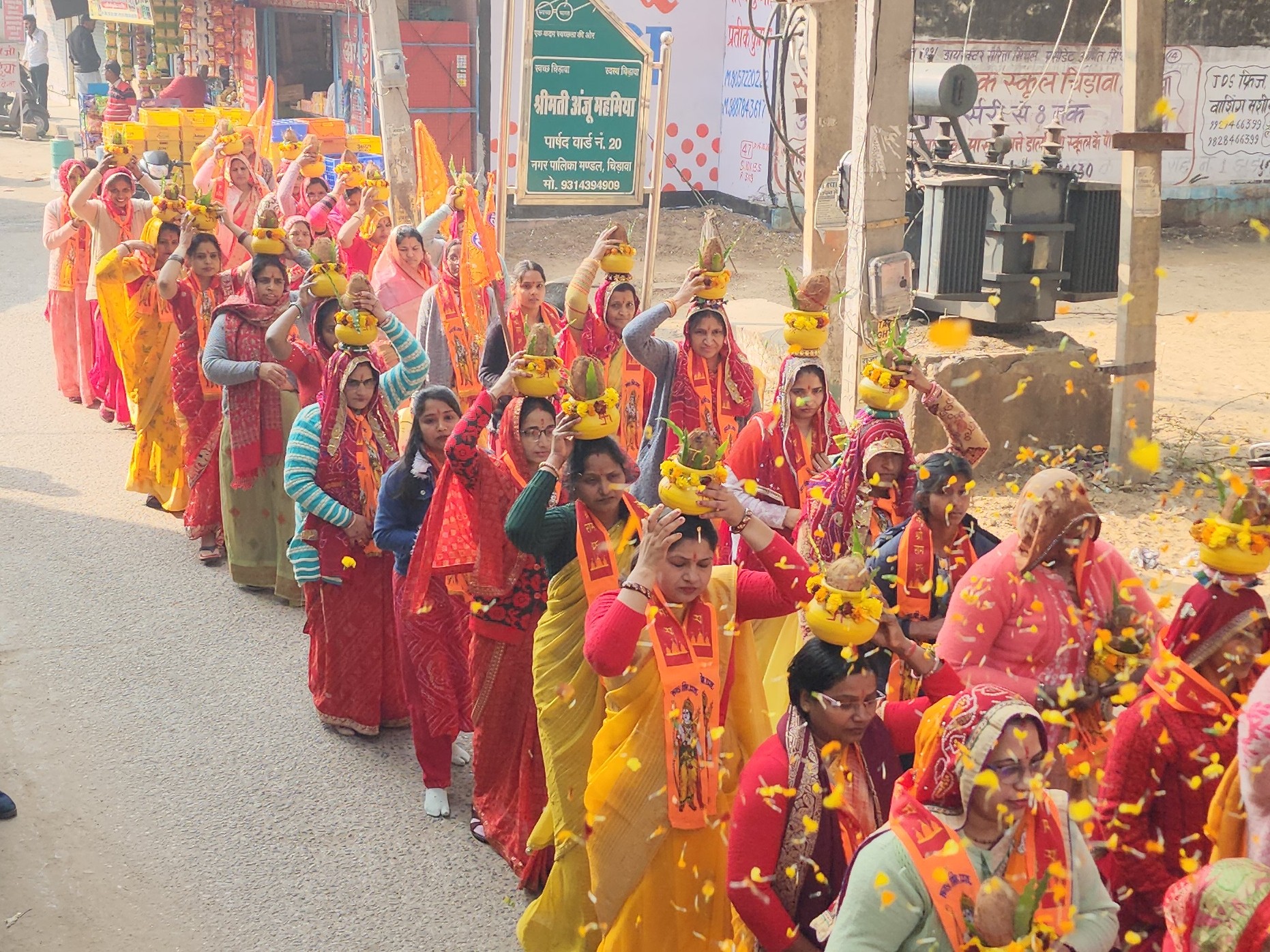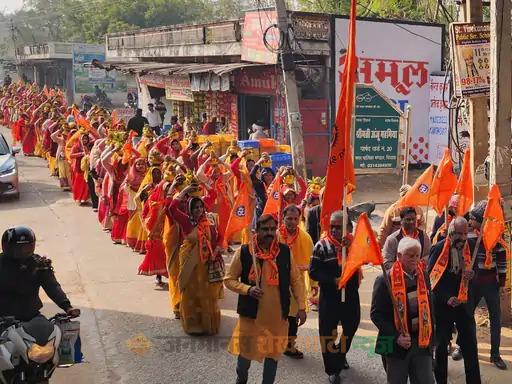 चिड़ावा में हिंदू महोत्सव के तहत कलश यात्रा निकाली:महिलाएं शामिल हुईं, कलश को मंच के पास सजाया और धर्म ध्वजा की स्थापना की