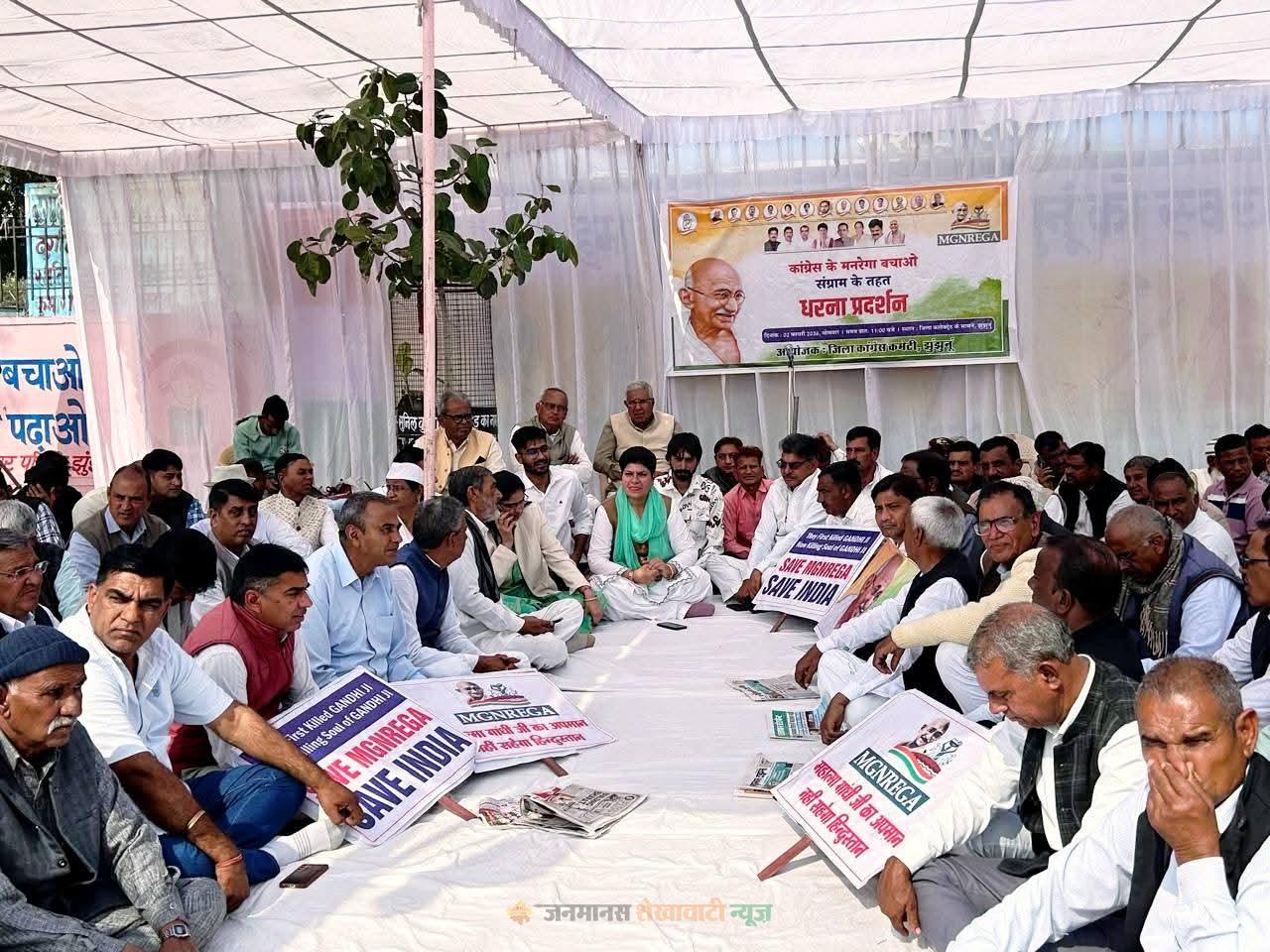 झुंझुनूं : केंद्र सरकार द्वारा महात्मा गांधी राष्ट्रीय ग्रामीण रोजगार गारंटी अधिनियम (मनरेगा) में किए गए संशोधनों और नए प्रावधानों के विरोध में सोमवार को झुंझुनूं जिला कलेक्ट्रेट पर कांग्रेस ने जोरदार प्रदर्शन किया। मण्डावा विधायक और कांग्रेस जिलाध्यक्ष रीटा चौधरी के नेतृत्व में बड़ी संख्या में कार्यकर्ता और मनरेगा मजदूर हाथों में कस्सी, परात और गेती लेकर पहुंचे। प्रदर्शन के दौरान केंद्र सरकार के खिलाफ जमकर नारेबाजी की गई और नए एक्ट को मजदूर विरोधी करार दिया गया।