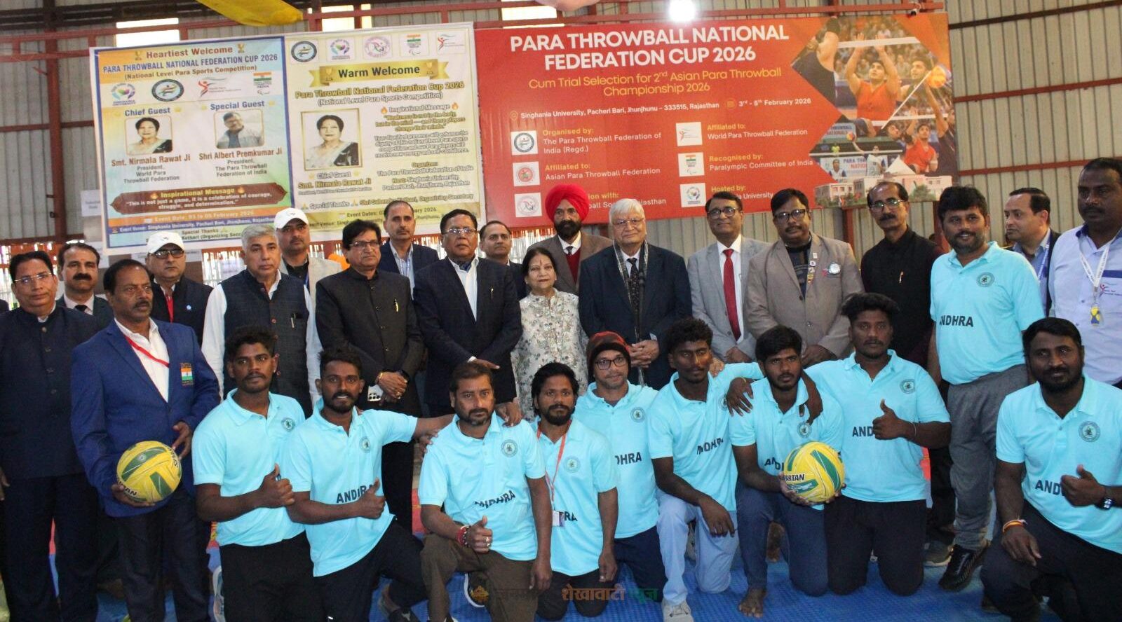 पचेरी बड़ी : सिंघानिया विश्वविद्यालय, पचेरी बड़ी के मारवाड़ इंडोर एरीना में पैरा थ्रोबॉल नेशनल फेडरेशन कप 2026 सह ट्रायल सेलेक्शन द्वितीय एशियन पैरा थ्रोबॉल चैंपियनशिप का भव्य उद्घाटन किया गया। तीन दिवसीय इस राष्ट्रीय प्रतियोगिता का आयोजन पैरा थ्रोबॉल फेडरेशन ऑफ इंडिया द्वारा किया जा रहा है, जिसकी मेजबानी सिंघानिया विश्वविद्यालय कर रहा है।