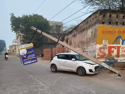 फतेहपुर : फतेहपुर के रामगढ़ कस्बे में बिसाऊ रोड पर एक तेज रफ्तार कार की टक्कर से बिजली का खंभा टूट गया। इस घटना के कारण क्षेत्र में करीब 10 घंटे तक बिजली आपूर्ति बाधित रही। ये घटना मंगलवार रात करीब एक बजे हुई। टक्कर इतनी जोरदार थी कि बिजली का खंभा टूटकर नीचे लटक गया, जिससे तेज धमाके की आवाज सुनाई दी।