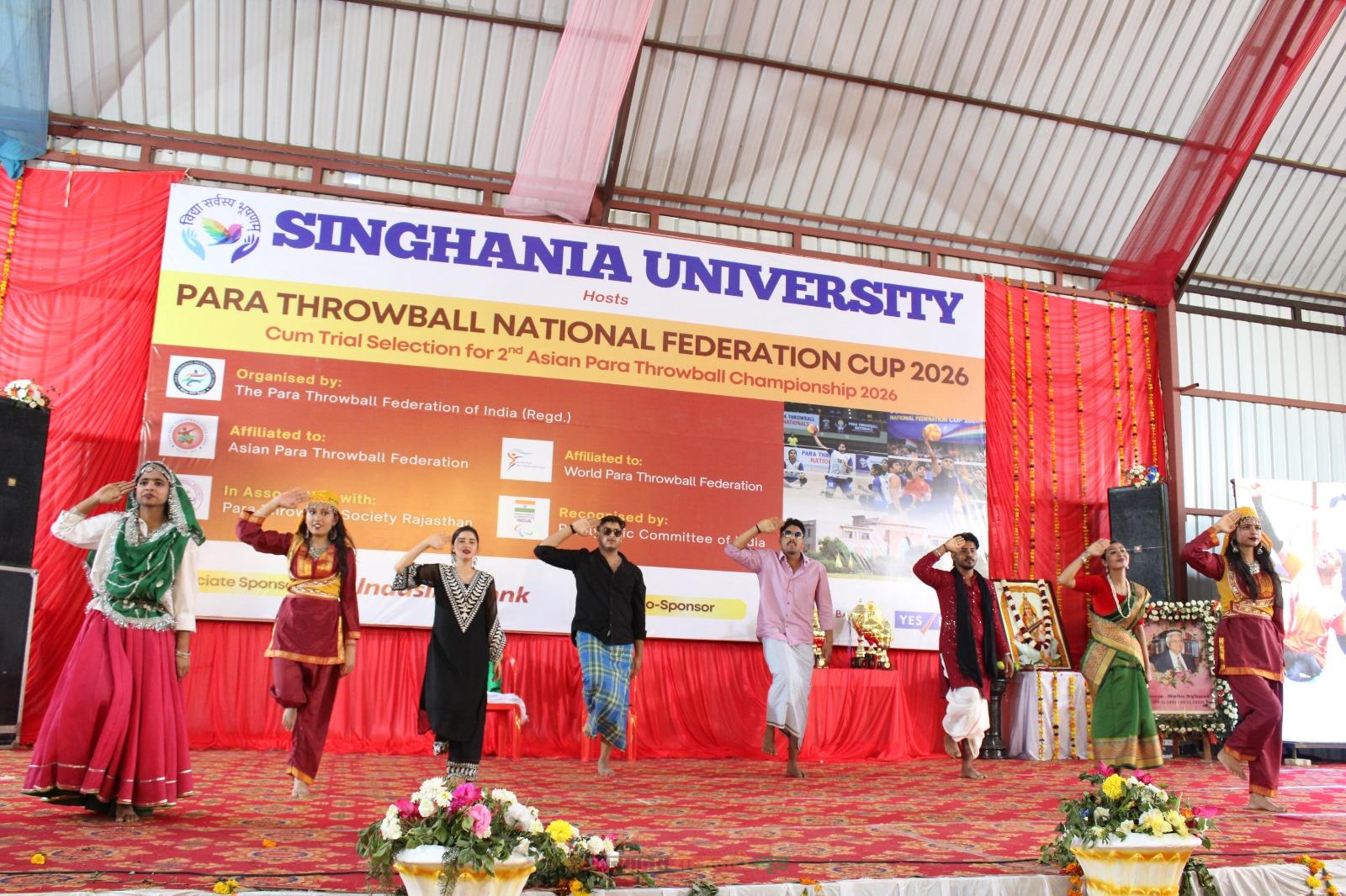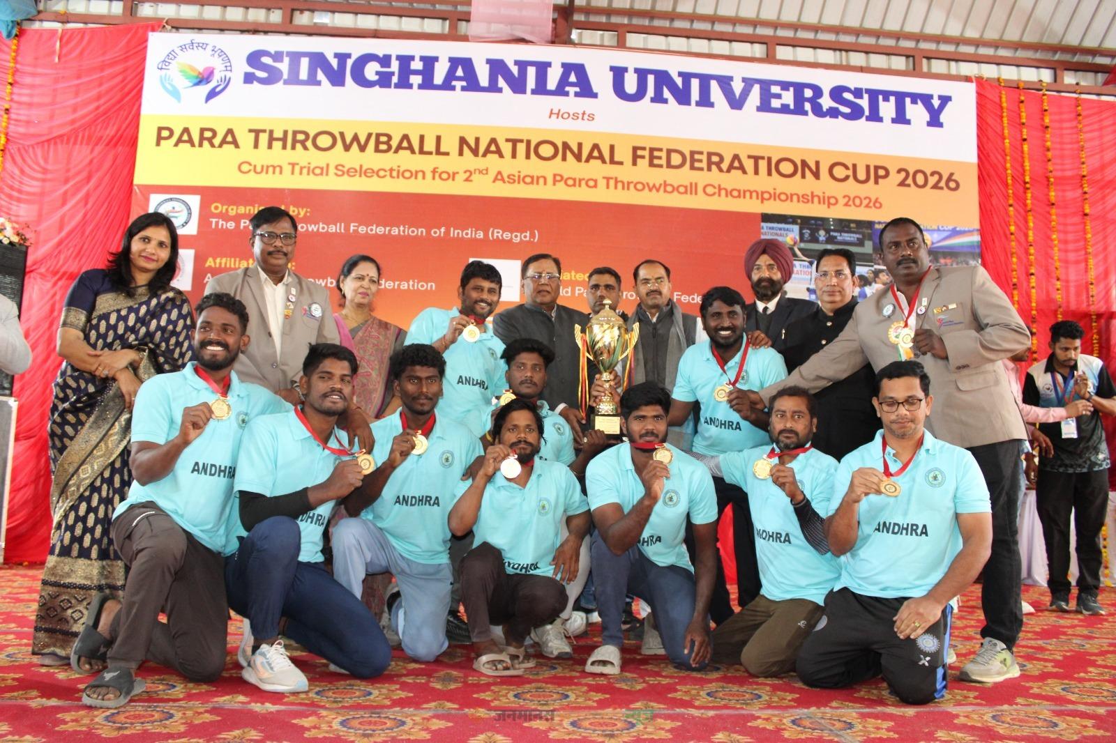 पचेरी कलां : सिंघानिया विश्वविद्यालय, पचेरी बड़ी में पैरा थ्रोबॉल फेडरेशन ऑफ इंडिया के तत्वावधान में आयोजित पैरा थ्रोबॉल नेशनल फेडरेशन कप 2026 सह ट्रायल चयन (द्वितीय एशियन पैरा थ्रोबॉल चैंपियनशिप 2026 हेतु) का तीन दिवसीय आयोजन भव्य एवं गरिमामय समापन समारोह के साथ सम्पन्न हुआ। समापन समारोह की शुरुआत अतिथियों द्वारा पौधरोपण के साथ की गई, इसके पश्चात सभी अतिथियों को शॉल एवं स्मृति-चिह्न भेंट कर सम्मानित किया गया।