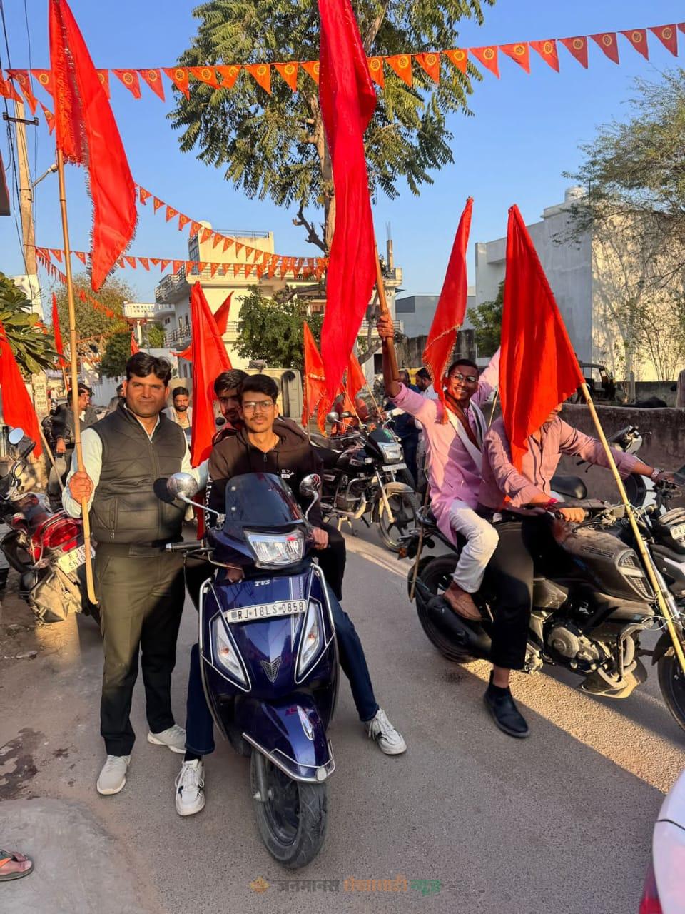 इस अवसर पर समिति संरक्षक रामचन्द्र शर्मा पटोदा, समिति अध्यक्ष विनोद पुजारी, सदस्य कमल कांत शर्मा, रामगोपाल शर्मा, सांवरमल सोनी, मुरारी जांगिड़, सुधीर चाहर, मनोज कुंडलवाल, नरेन्द्र शर्मा, कैलाश कुमावत, अनिल कुमासिया, सुरेंद्र कुमावत, मिलन कुमावत, मनोज कुमावत, विजय कुमार, महेश कुमार, धर्मपाल प्रजापत, योगेश बंशाल, गुमानसिह, अजय कुमावत, नितिन शर्मा, बजरंग अग्रवाल सहित बड़ी संख्या में बस्ती के गणमान्य लोगों ने भगवा ध्वज वाहन शोभा यात्रा में भाग लिया ।