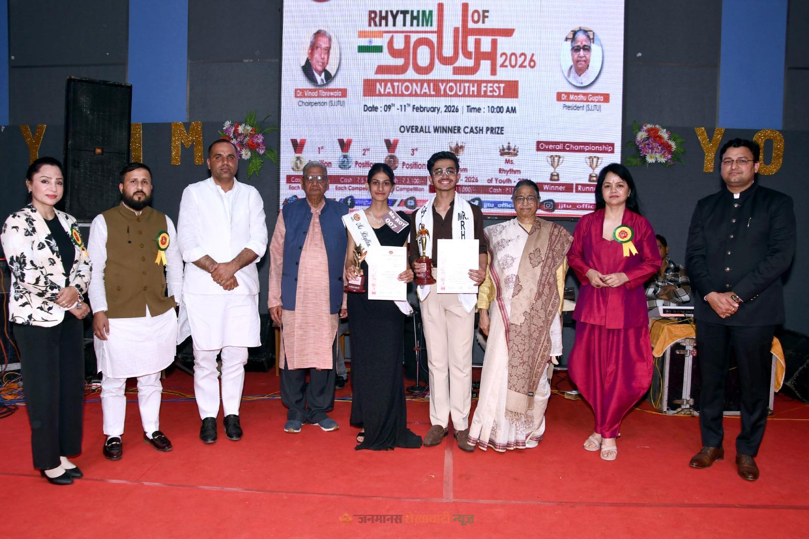 प्रतियोगिता के परिणामों की घोषणा करते हुए डॉ. अरुण कुमार ने बताया कि मिस्टर रिदम ऑफ यूथ 2026 का खिताब श्री जेजेटी यूनिवर्सिटी के कार्तिक राठौड़ ने अपने नाम किया। वहीं मिस रिदम ऑफ यूथ 2026 का ताज गवर्नमेंट गर्ल्स कॉलेज, चूरू की दीपांशी यादव को मिला। महोत्सव की ओवरऑल विनर ट्रॉफी श्री जेजेटी यूनिवर्सिटी ने जीती, जबकि रनर-अप ट्रॉफी राजस्थान यूनिवर्सिटी, जयपुर को प्रदान की गई।