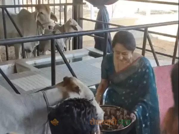 उदयपुरवाटी पहुंची हेमा मालिनी, गायों को खिलाया गुड़:गुढ़ागौड़जी में एक कार्यक्रम में शामिल होने आईं थीं; श्याम बाबा की तस्वीर देकर किया स्वागत