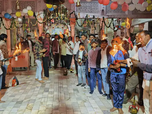 नीमकाथाना : नीमकाथाना के बालेश्वर धाम में महाशिवरात्रि पर एक अनूठी परंपरा देखने को मिलती है। यहां शाम की आरती से लेकर सुबह तक मंदिर के मुख्य द्वार से गर्भगृह तक मशालें जलाई जाती हैं। यह दृश्य आस्था का केंद्र बन जाता है।