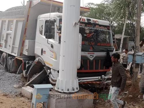 चूरू में डंपर ने रैलिंग तोड़ी, पोल से टकराया:ड्राइवर हो गया फरार, पंखा सर्किल पर लगा जाम