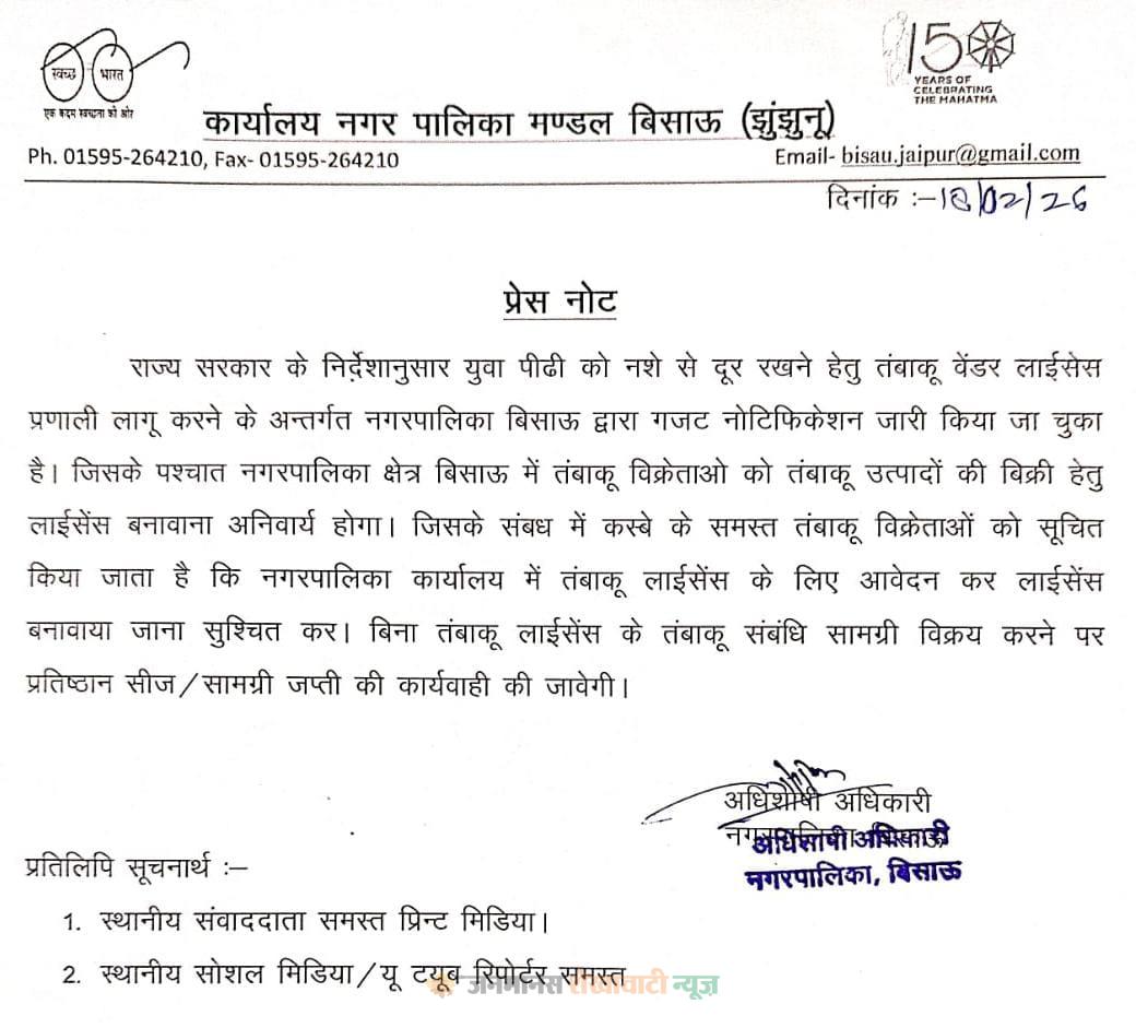 उन्होंने बताया कि राज्य सरकार के निर्देशानुसार युवा पीढ़ी को नशे से दूर रखने के उद्देश्य से तंबाकू वेंडर लाइसेंस प्रणाली लागू की गई है। इसके तहत नगरपालिका बिसाऊ द्वारा गजट नोटिफिकेशन जारी किया जा चुका है।
