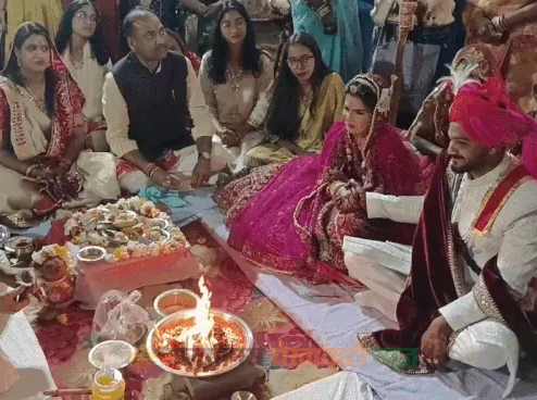 मैरिज गार्डन में 2 अलग-अलग वेदी पर एक ही समय दोनों बेटियों ने फेरे लिए। बेटी निकिता ने विशाल के साथ सात फेरे लिए, जिनका कन्यादान मां किरण देवी व पिता राधेश्याम सरवन ने किया और पंडित मधुसूदन जोशी व नानूराम शर्मा ने मंत्रोच्चार किए।