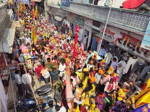 उदयपुरवाटी में सूरजगढ़ के प्राचीन निशान का स्वागत:श्रद्धालुओं ने धोक लगाकर मोर छड़ी का झाड़ा लगवाया, 10 किलोमीटर में 100 से ज्यादा सेवा शिविर लगाए गए