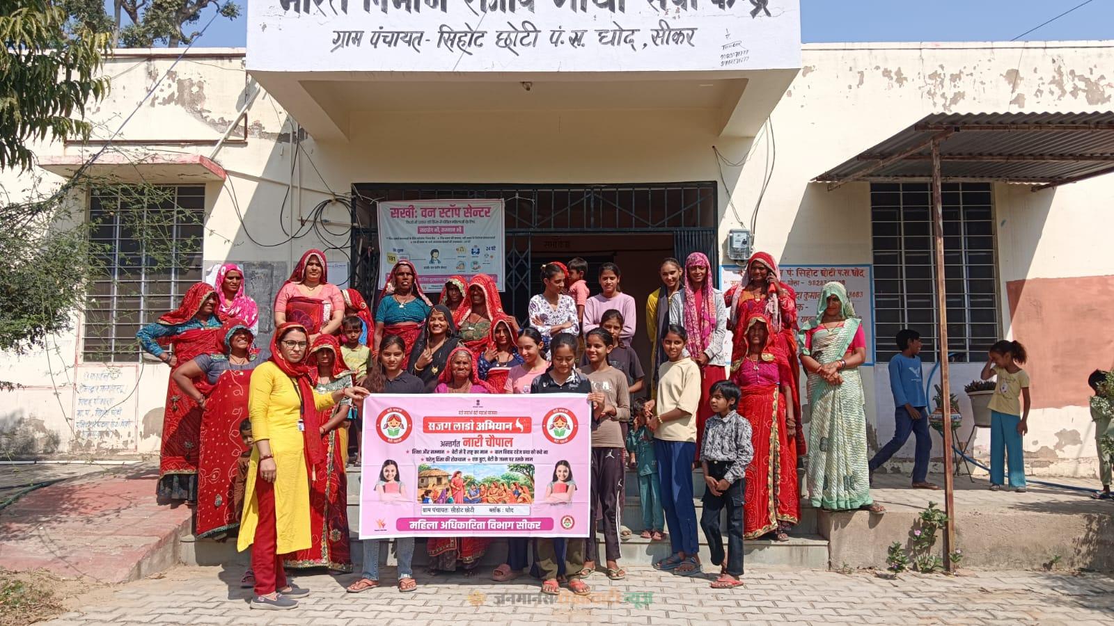 सीकर : ब्लॉक धोद अंतर्गत सीहोट छोटी ग्राम पंचायत में महिला सशक्तिकरण एवं बालिका सम्मान को बढ़ावा देने के उद्देश्य से साथिन ममता देवी द्वारा कार्यालय उपनिदेशक महिला अधिकारिता विभाग के दिशा निर्देशानुसार नारी चौपाल का आयोजन किया गया। कार्यक्रम में ग्राम पंचायत क्षेत्र की महिलाओं ने उत्साहपूर्वक भाग लिया।