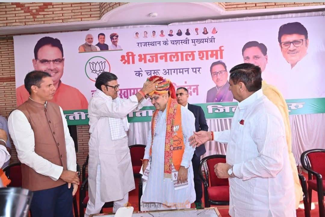 चूरू विधानसभा के मंडल अध्यक्ष सुरेश सारस्वत, धर्मेन्द्र राकसिया, विजय कस्वां, निर्मल सैन, दौलतराम प्रजापत, सुप्यार सिंह और रामचन्द्र शर्मा ने मुख्यमंत्री को 31 किलो फूलों की माला पहनाकर स्वागत किया। कार्यक्रम का संचालन जिला उपाध्यक्ष भास्कर शर्मा और जिला मीडिया संयोजक रवि दाधीच ने किया।