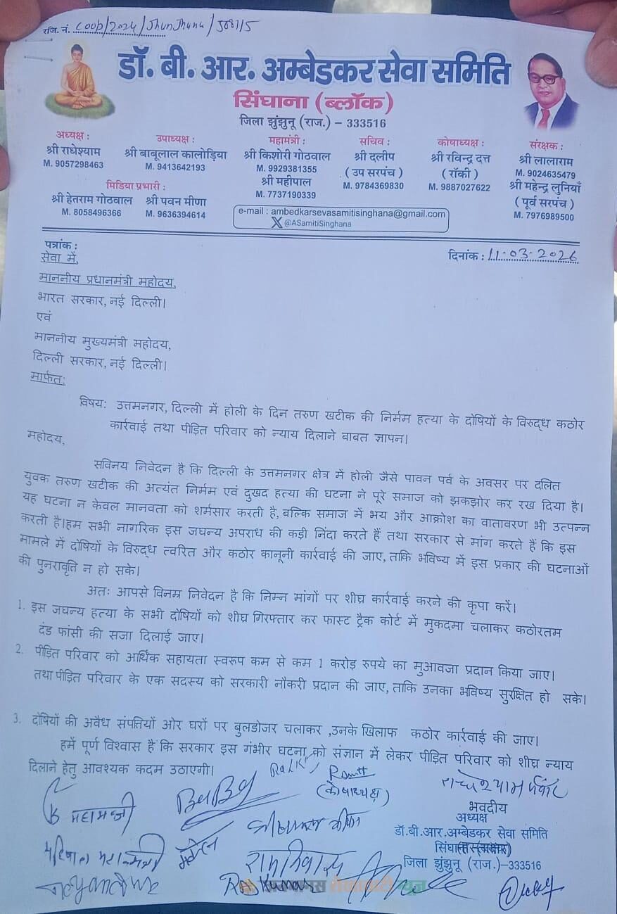 डॉ. बी.आर. अंबेडकर सेवा समिति की ओर से दिए गए ज्ञापन में बताया गया कि दिल्ली के उत्तमनगर क्षेत्र में तरुण खटीक की हत्या ने पूरे समाज को झकझोर दिया है। ग्रामीणों ने इसे मानवता को शर्मसार करने वाली घटना बताया, जिससे समाज में भय का माहौल पैदा हो रहा है। उन्होंने त्योहारों पर सुरक्षा व्यवस्था पर भी सवाल उठाए।