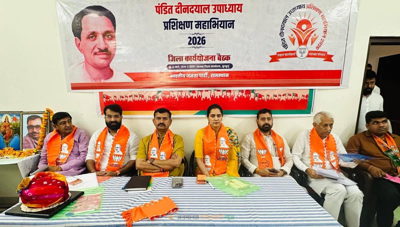 झुंझुनूं : भाजपा जिला कार्यालय झुंझुनूं में पं. दीनदयाल उपाध्याय प्रशिक्षण महाभियान 2026 के तहत शुक्रवार को जिला स्तरीय कार्यशाला का आयोजन किया गया। कार्यक्रम की अध्यक्षता भाजपा जिलाध्यक्ष हर्षिनी कुल्हरी ने की, जबकि मुख्य वक्ता के रूप में प्रदेश महामंत्री श्रवण सिंह बगड़ी तथा प्रदेश सह-कोषाध्यक्ष डॉ. श्याम अग्रवाल उपस्थित रहे।
