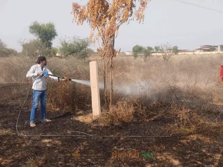 नंदी शाला के सामने मैदान में लगी आग:खरपतवार जलकर राख, फायर ब्रिगेड ने पाया काबू